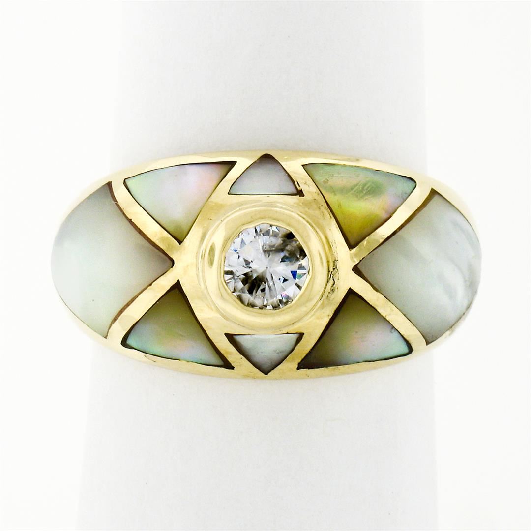 An estate solid 18k yellow gold band ring, with 1 round brilliant cut natural diamond (G - SI1 ; 0.33ct), 2 custom marquise cut natural mother of pearls, and 6 custom triangular cut natural mother of pearls. The ring is size 6.0, weighs a total of 11.79 grams, and measures 11mm wide.