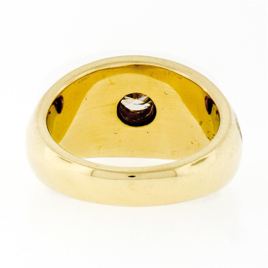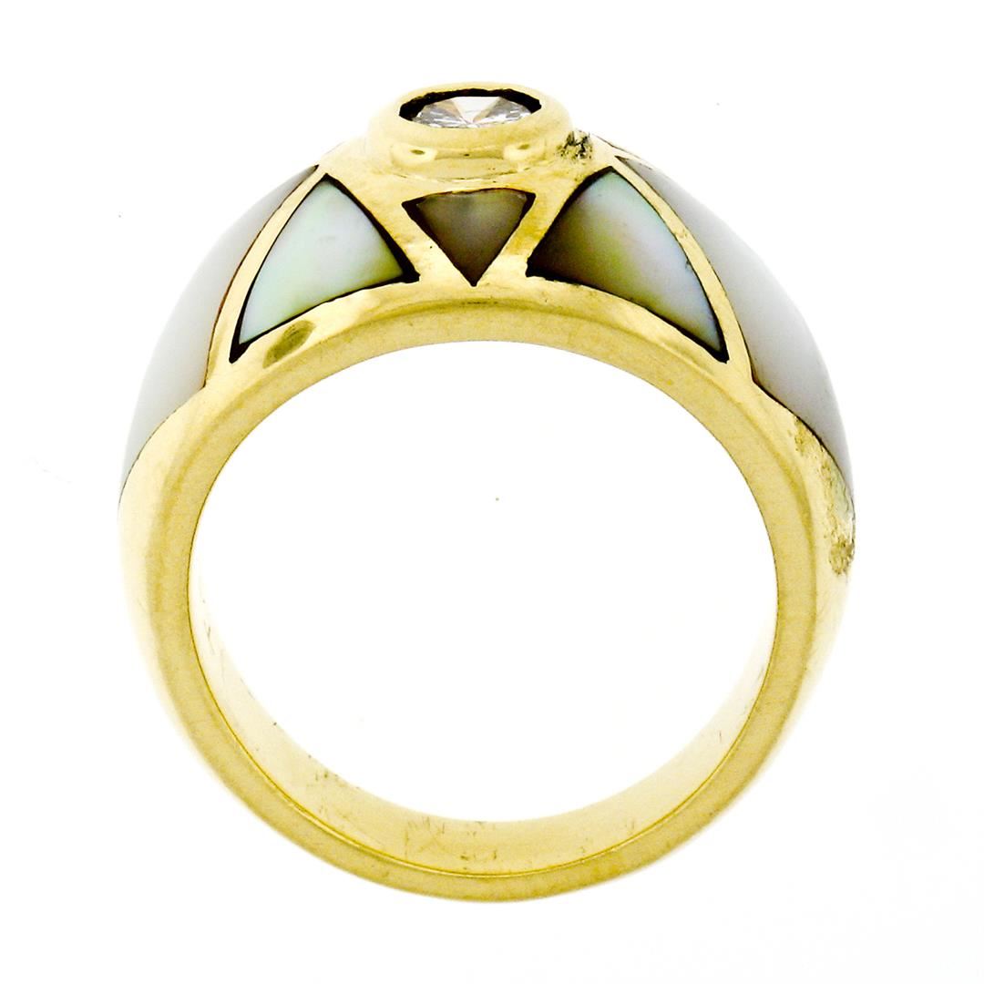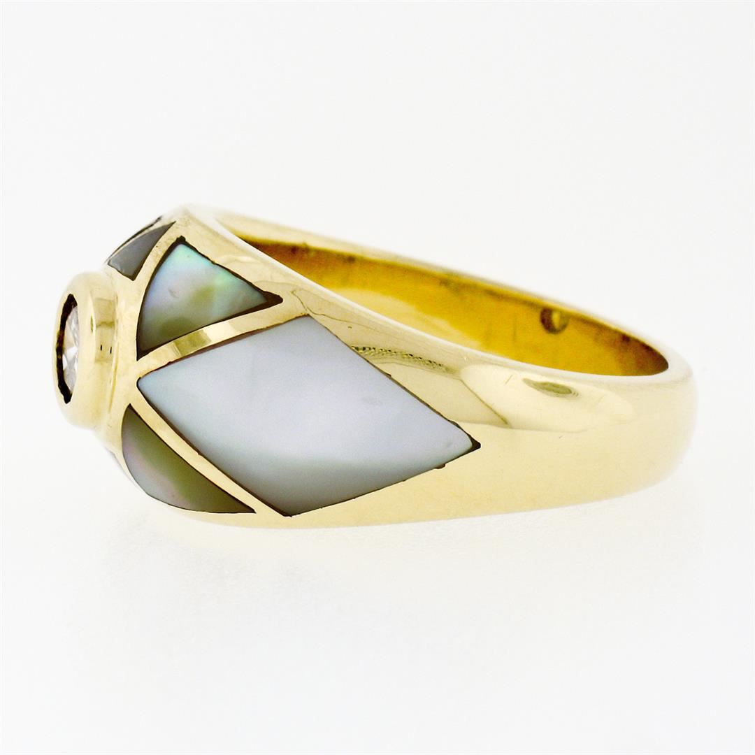 An estate solid 18k yellow gold band ring, with 1 round brilliant cut natural diamond (G - SI1 ; 0.33ct), 2 custom marquise cut natural mother of pearls, and 6 custom triangular cut natural mother of pearls. The ring is size 6.0, weighs a total of 11.79 grams, and measures 11mm wide.