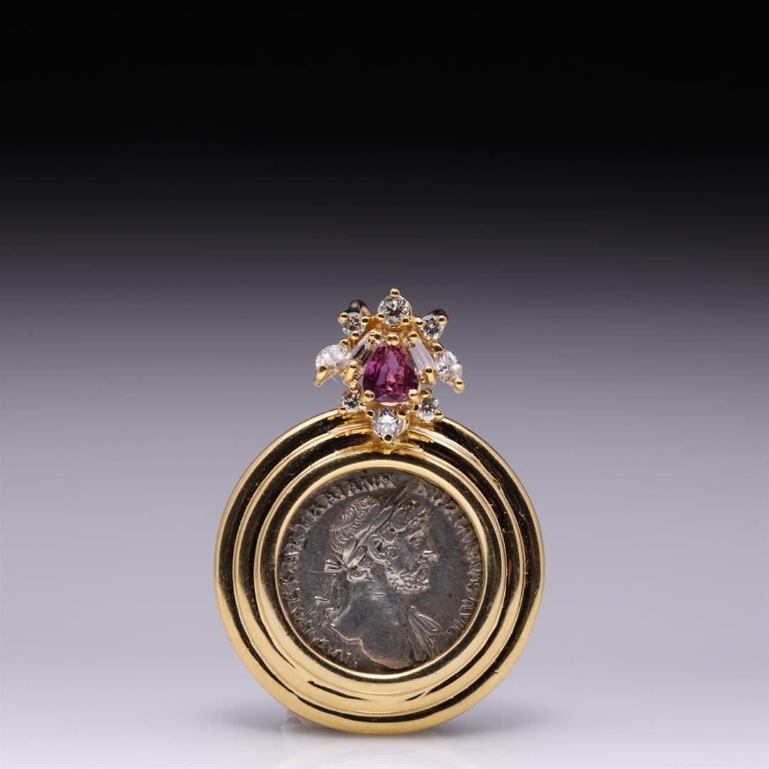 18k yellow gold pendant; the bale elaborately adorned with central unusual cut ruby surrounded by numerous diamonds; the center a silver Imperial Roman denarius, the coin from the reign of Caesar; 11.9 g, 1 3/8" x 1" (approx.)