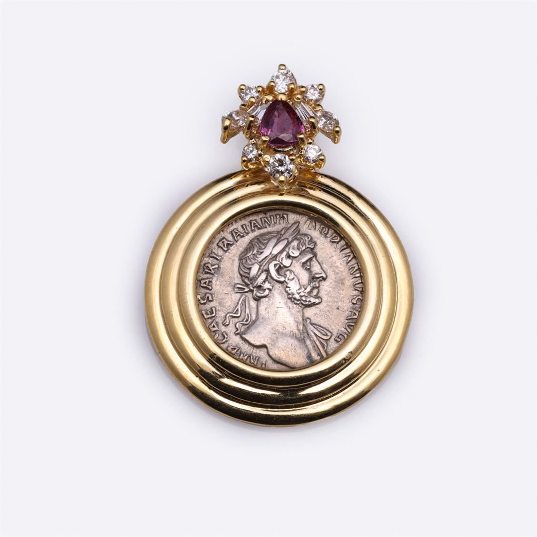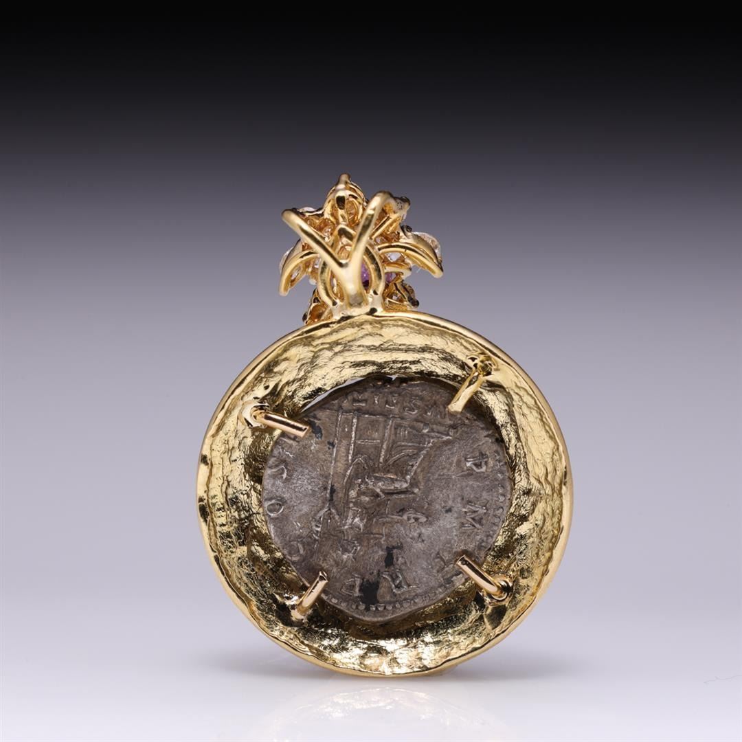 18K Yellow Gold Diamond, Ruby and Silver Imperial Roman Denarius Pendant