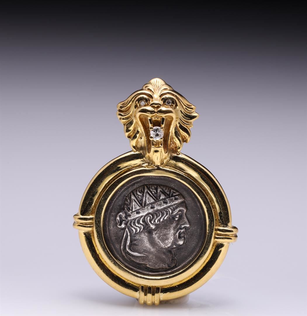 18K Yellow Gold Diamond & Silver Medallion of Nero Pendant Designed by R. L. Kay containing three diamonds weighing approximately 0.50 cts. Total weight is 14.2 gm. Estimated retail value $2,800.