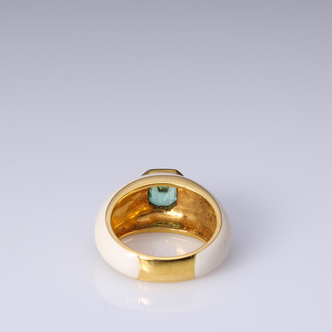 18K Yellow Gold Enamel & Emerald Ring containing one emerald cut emerald 5.5mm x 4.8mm weighing approximately 1.20cts. Total weight of ring is 11.5gm. Estimated retail value $3,750.