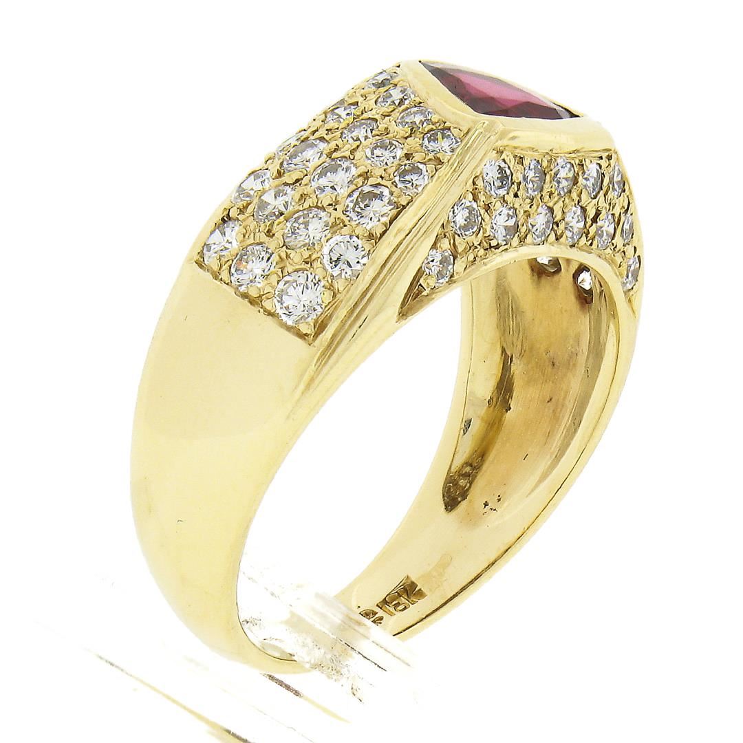 A solid 18k yellow gold ring, with 1 GIA graded triangular cut natural ruby (0.78ct), and 57 round cut natural diamonds (G/H - VS1/VS2 ; 0.85ctw). The ring is size 7.0, weighs a total of 5.99 grams, and measures 9.80mm wide. Comes with all original relevant certifications.