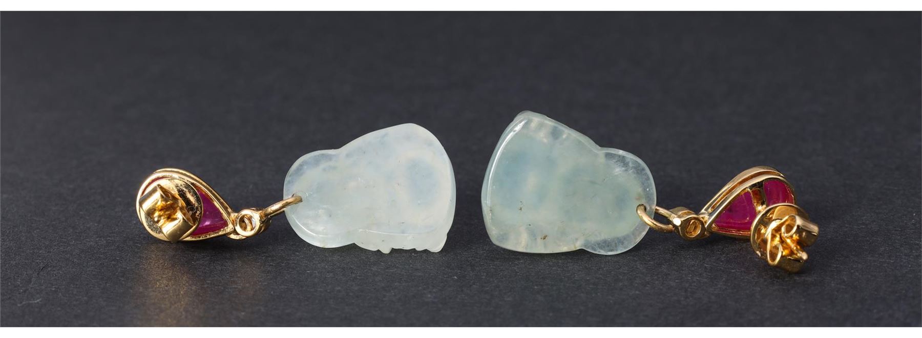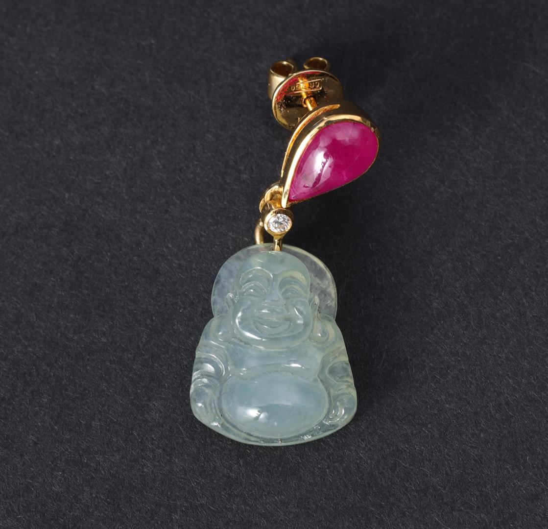 Pair of 18k yellow gold earrings by Carlo Rici; each earring with ice jadeite carving of seated Buddha with single diamond and teardrop ruby cabochon, the earring backs marked RICI CR750; gross weight 8.1g L 1 1/4 inches (approx.)