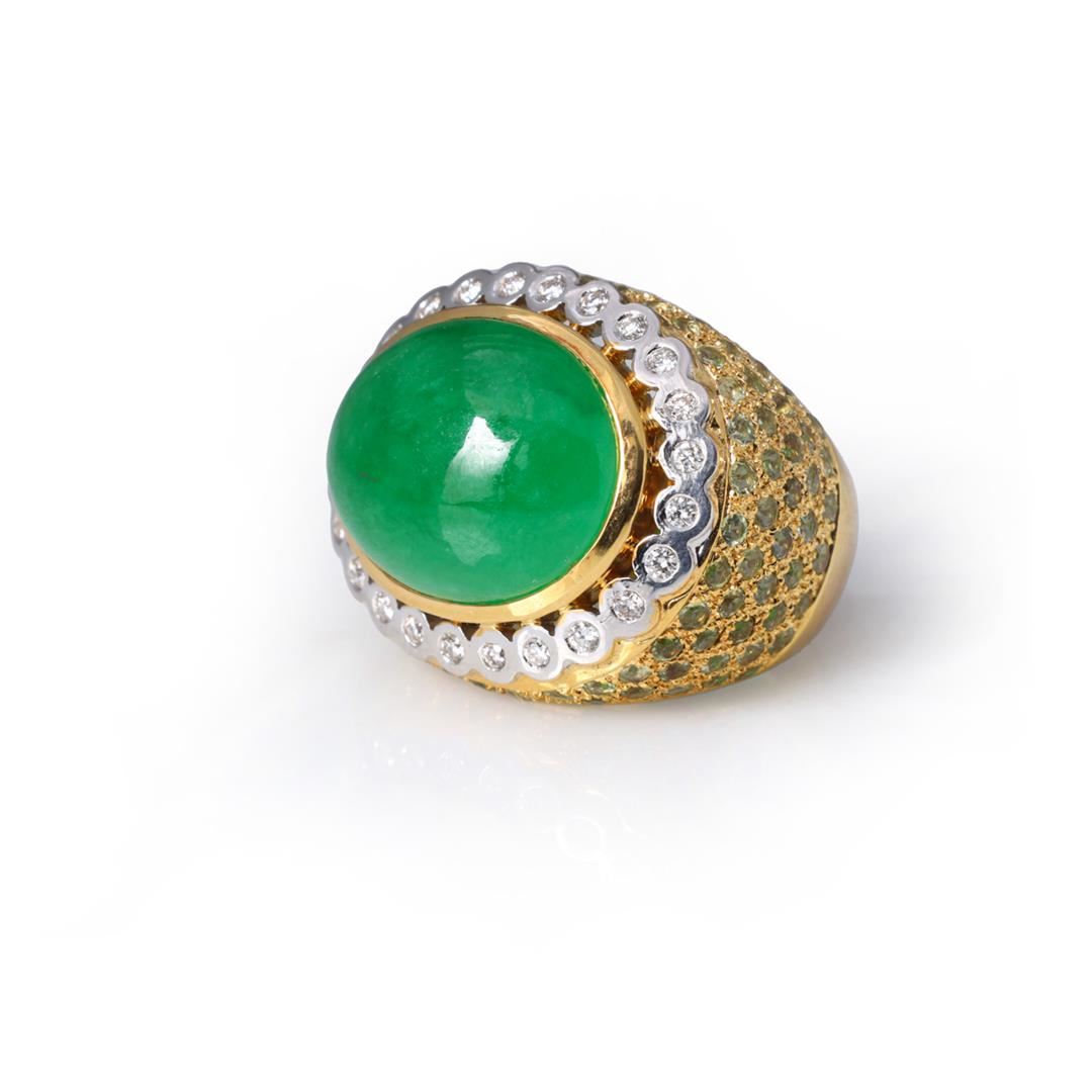 18K Yellow Gold Jadeite Peridot & Diamond Ring containing one oval cabochon 18mm x 14.3mm jadeite. Twenty-four round brilliant cut diamonds weighing approximately 0.60 cts. One hundred four peridot weighing 2.10 cts. Total weight of ring is 21 gm. Estimat