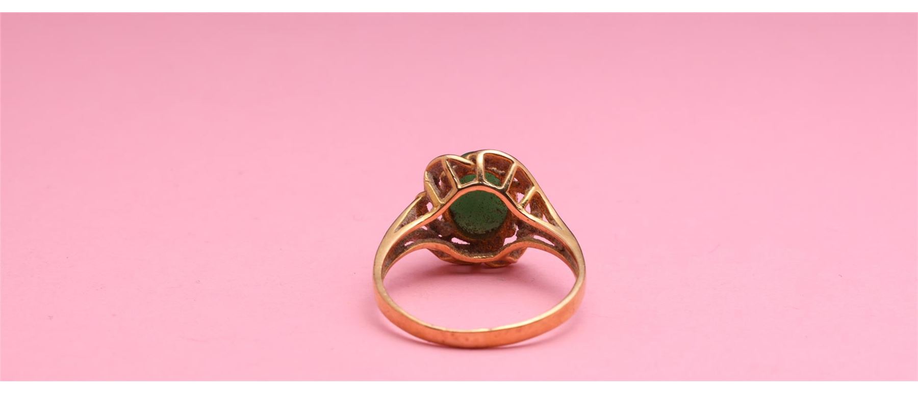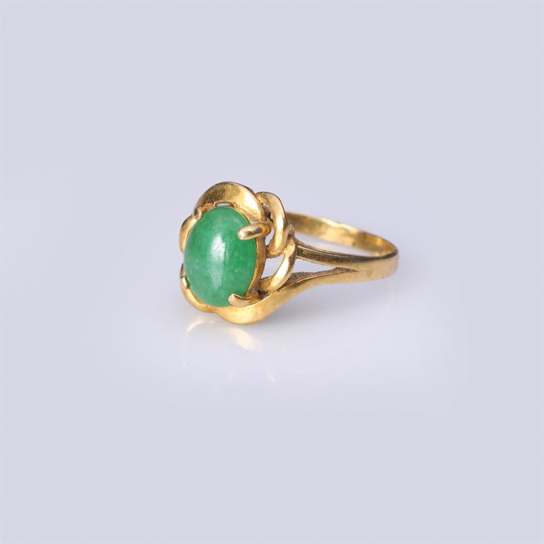 18k yellow gold ring with central jadeite cabochon claw set; marked 18k 750; gross weight 2.6 g, size 5 1/2