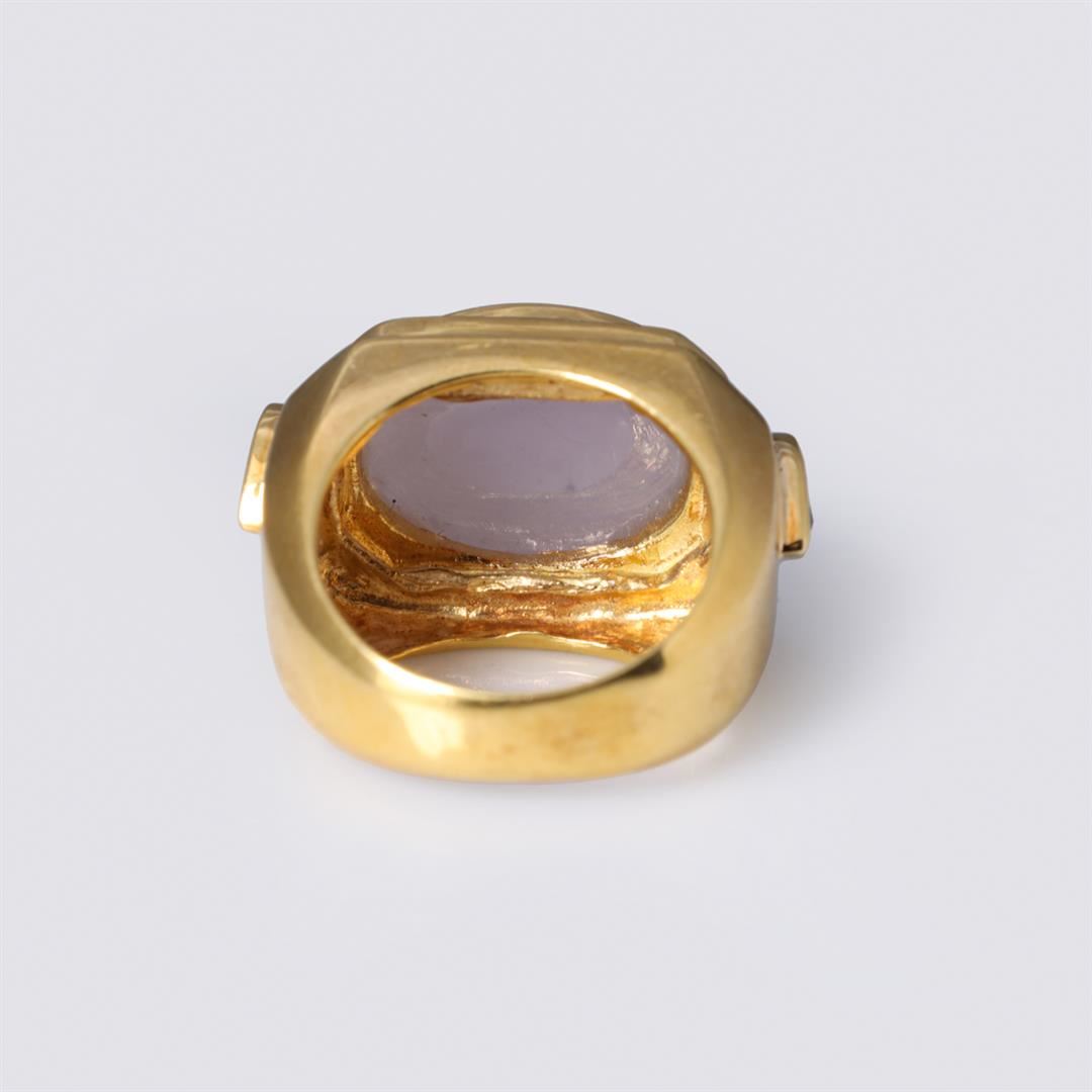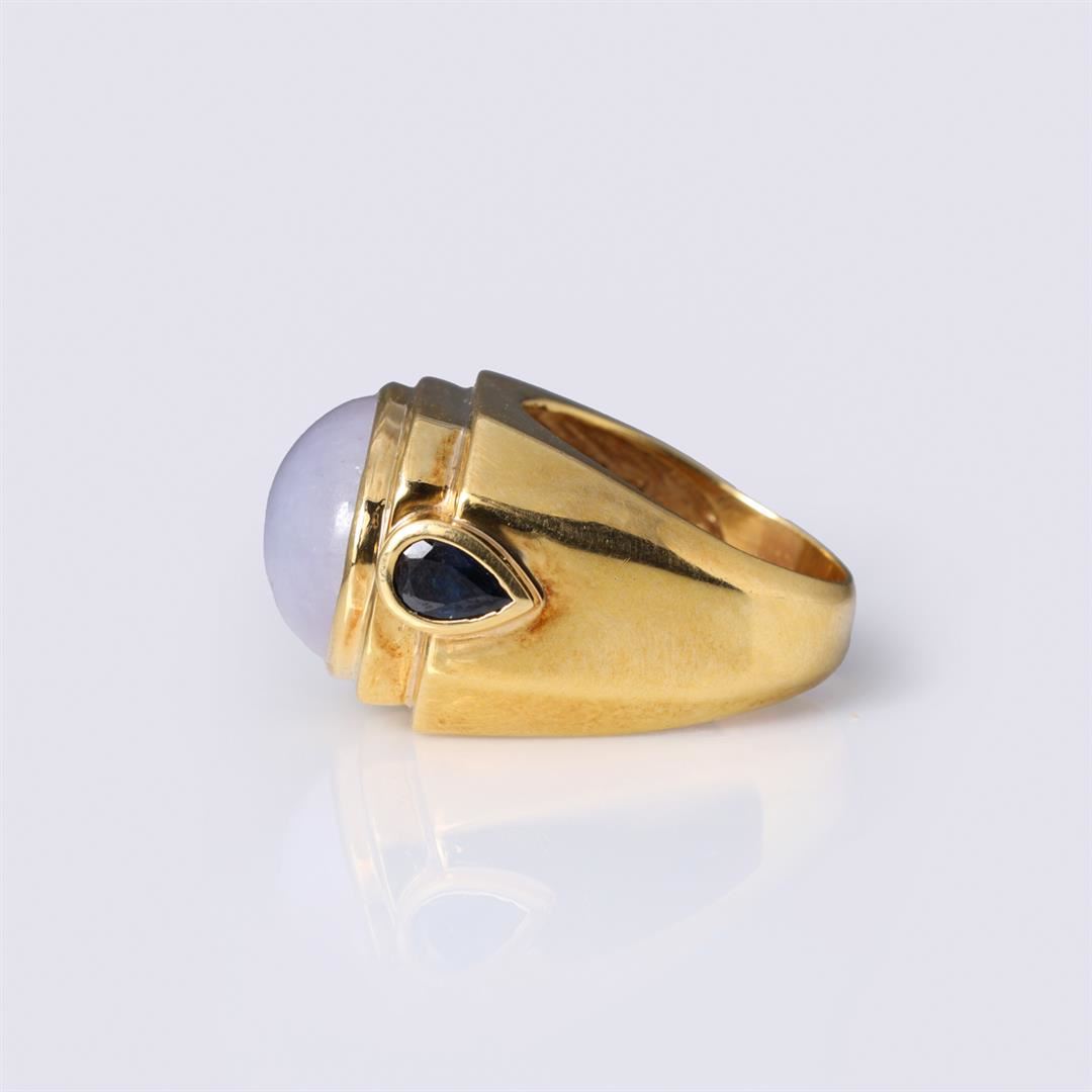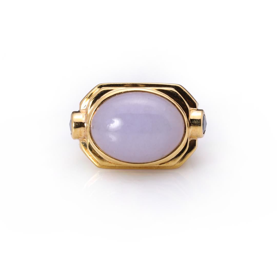18k yellow gold ring; center set with large lavender jadeite cabochon and twin teardrop sapphires to each shoulder, marked 18k to interior; gross weight 19.9 g, size 7