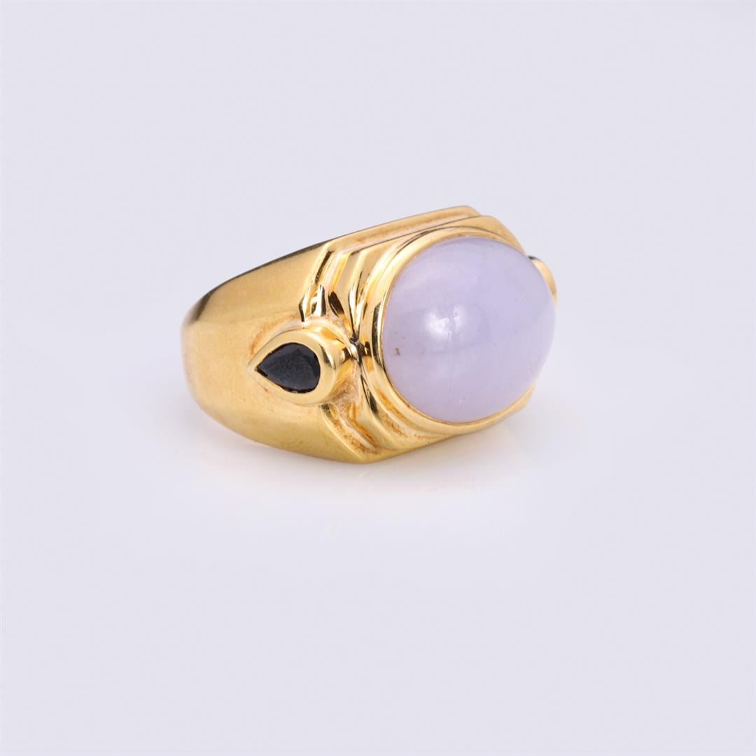 18k yellow gold ring; center set with large lavender jadeite cabochon and twin teardrop sapphires to each shoulder, marked 18k to interior; gross weight 19.9 g, size 7