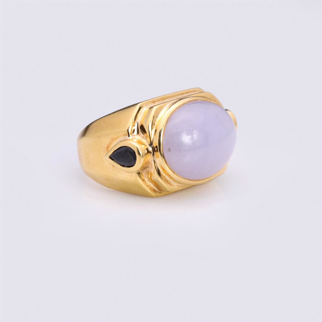 18K Yellow Gold lavender Jadeite & Sapphire Ring containing oval lavender Jadeite 17.6mm x 13.3mm. Two pear shaped sapphires 0.60 cts. Total weight of ring is 20 gm. Estimated retail value $8,900.