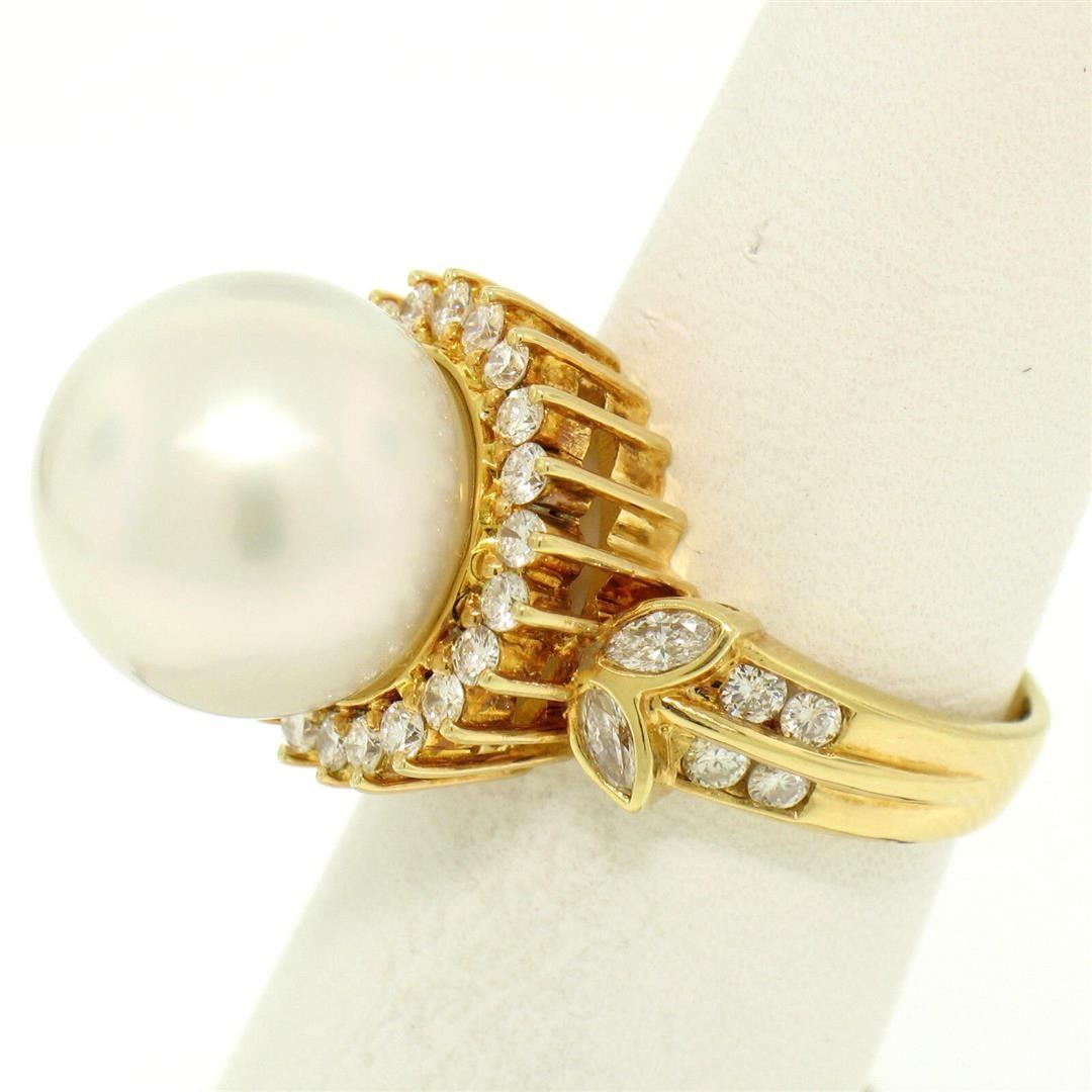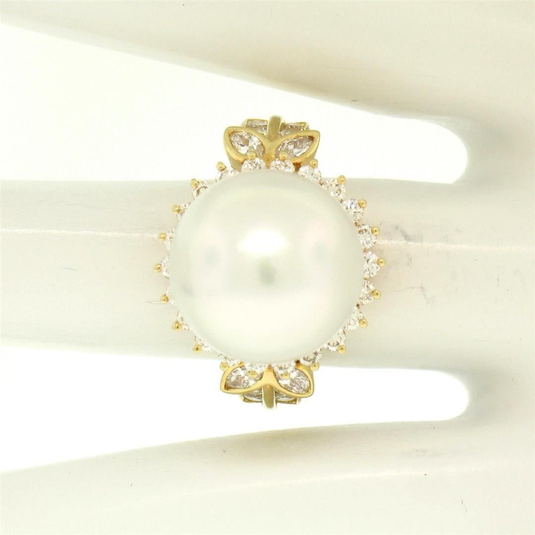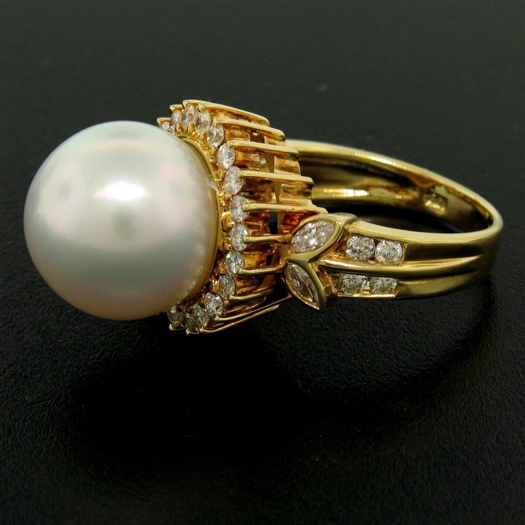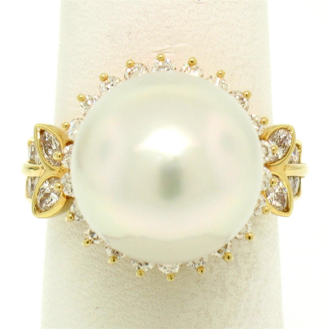 An estate solid 18k yellow gold solitaire ring featuring 1 South Seas Pearl (13.3mm) with a halo of 30 round cut natural diamonds (F/G - VS1; 0.65ctw) and 4 marquise cut naturak diamonds (F - VS1; 0.30ctw). The ring is size 7.5, weighs a total of 11.6 grams, and measures 16mm wide.