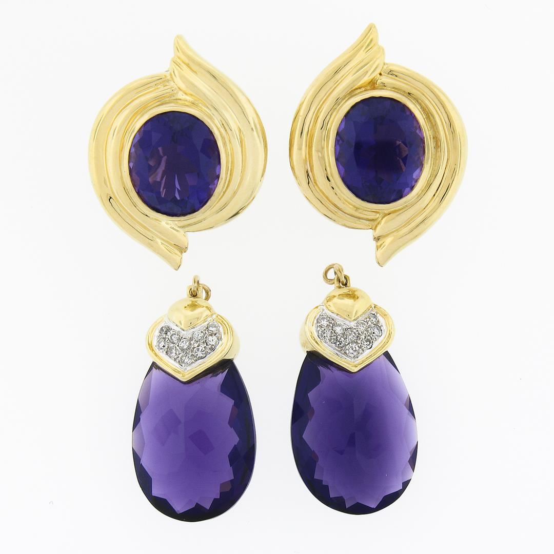 A solid 18k yellow gold enhancer day night dangle earrings, with 2 oval cut natural amethysts (11x13mm / 11.0ctw), and 2 pear cut natural amethysts (14.0ctw), and 20 round brilliant cut natural diamonds (F/G - VS1/VS2 ; 0.25ctw). The earrings measure approximately 60.60x21.80mm and weigh a total of 33.24 grams.