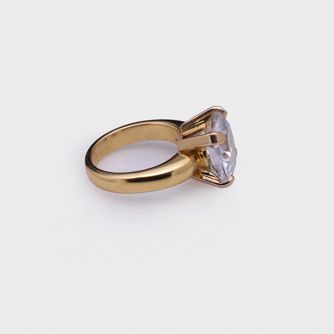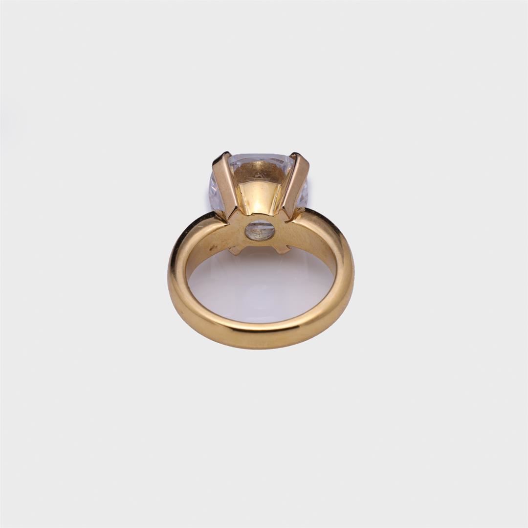 18K Yellow Gold & Moissanite Ring containing one cushion cut moissanite weighing approximately 8.50 cts. Total weight of ring is 13 gm. Estimated retail value $3,500.