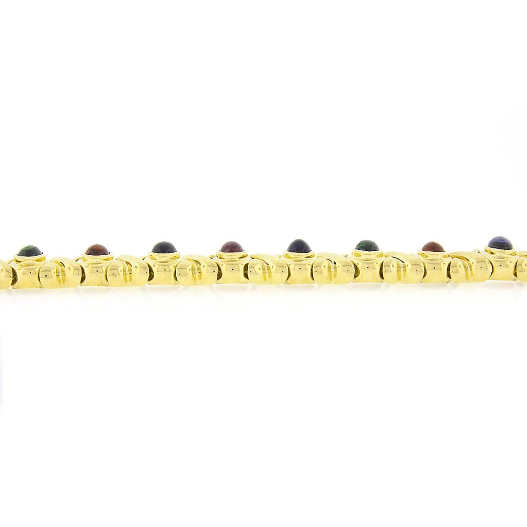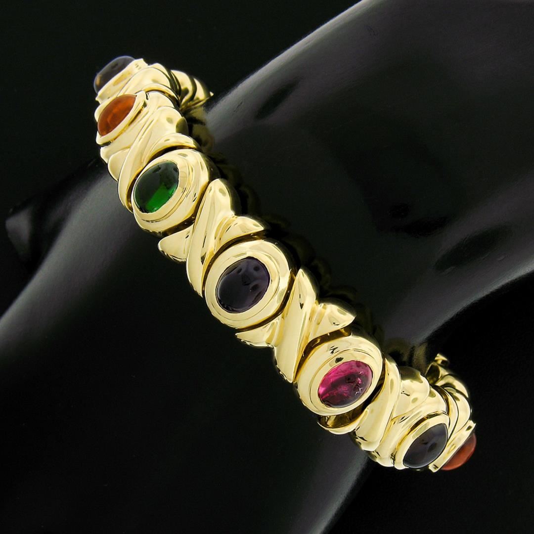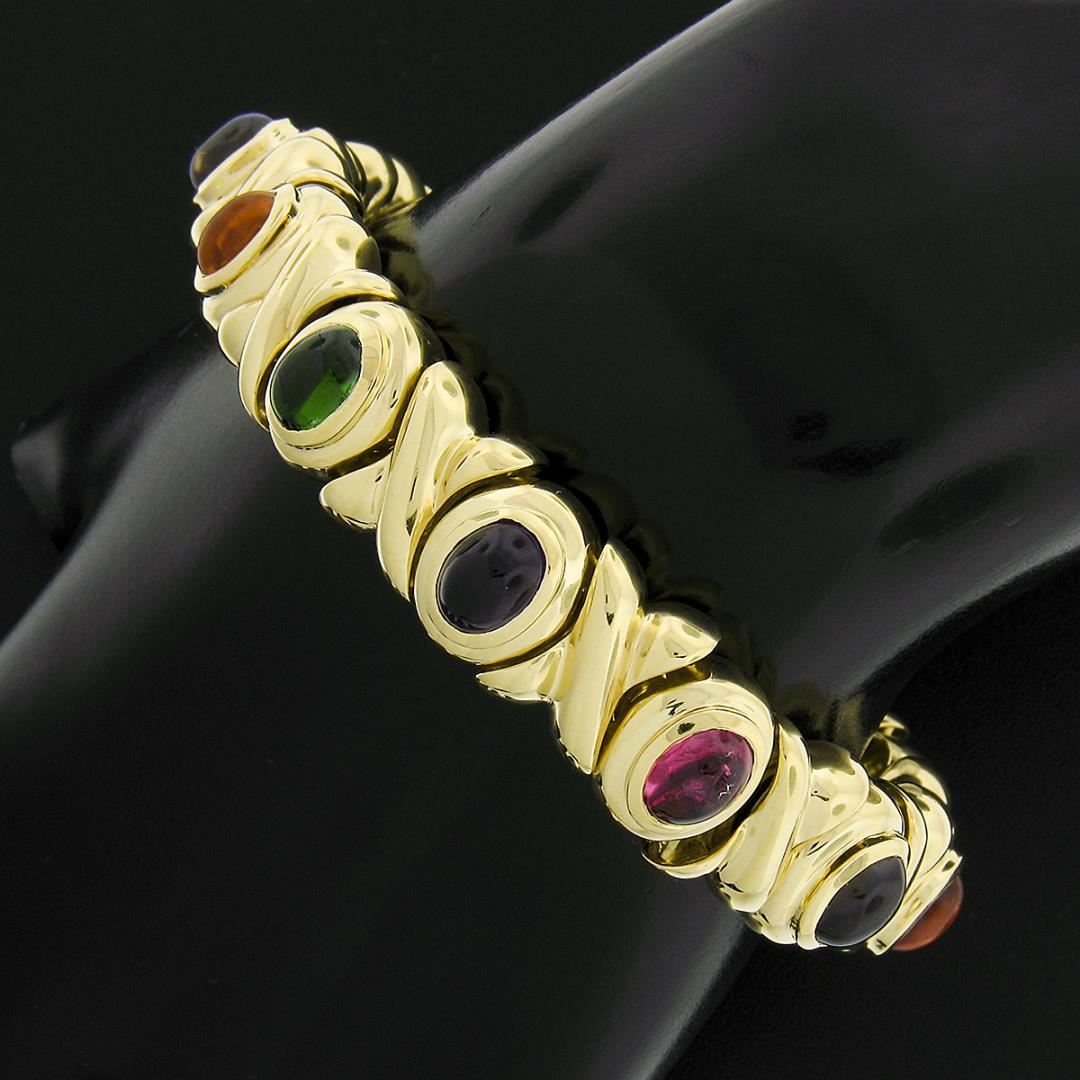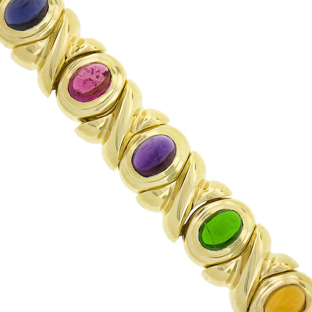 A solid 18k yellow gold XO link bracelet, with 12 oval cabochon cut natural amethyst, tourmaline, Iolite, citrine, & tsavorite (7.6x5.6mm each). It weighs a total of 65.69 grams, measures 13mm wide, and measures 6.75 inches in length.