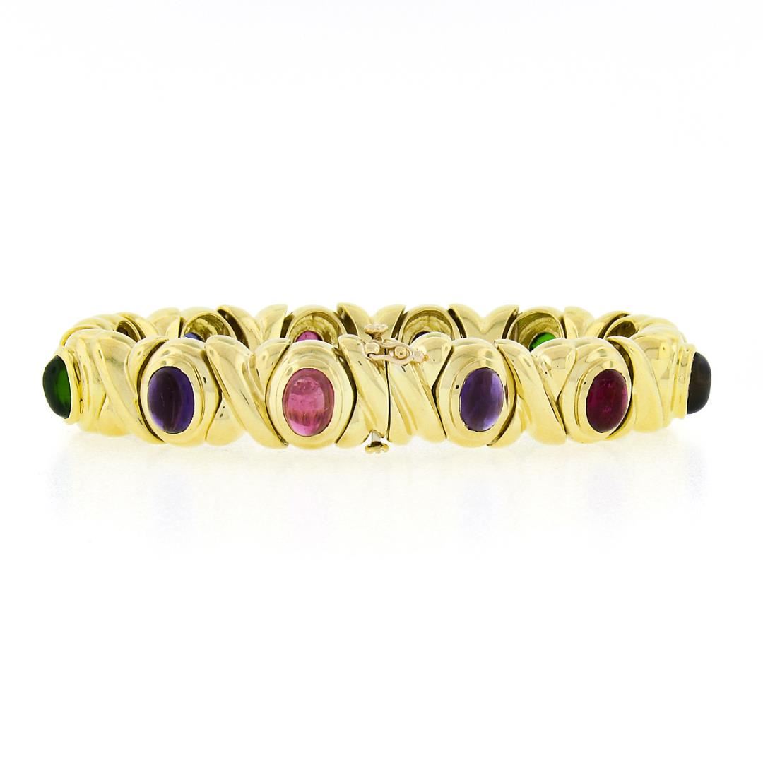 A solid 18k yellow gold XO link bracelet, with 12 oval cabochon cut natural amethyst, tourmaline, Iolite, citrine, & tsavorite (7.6x5.6mm each). It weighs a total of 65.69 grams, measures 13mm wide, and measures 6.75 inches in length.