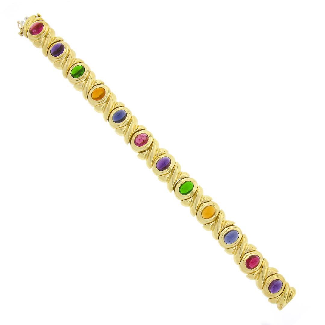 18K Yellow Gold Oval Cabochon Bezel Multi Color Gemstone Wide X O Link Bracelet