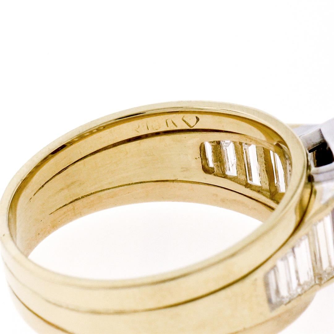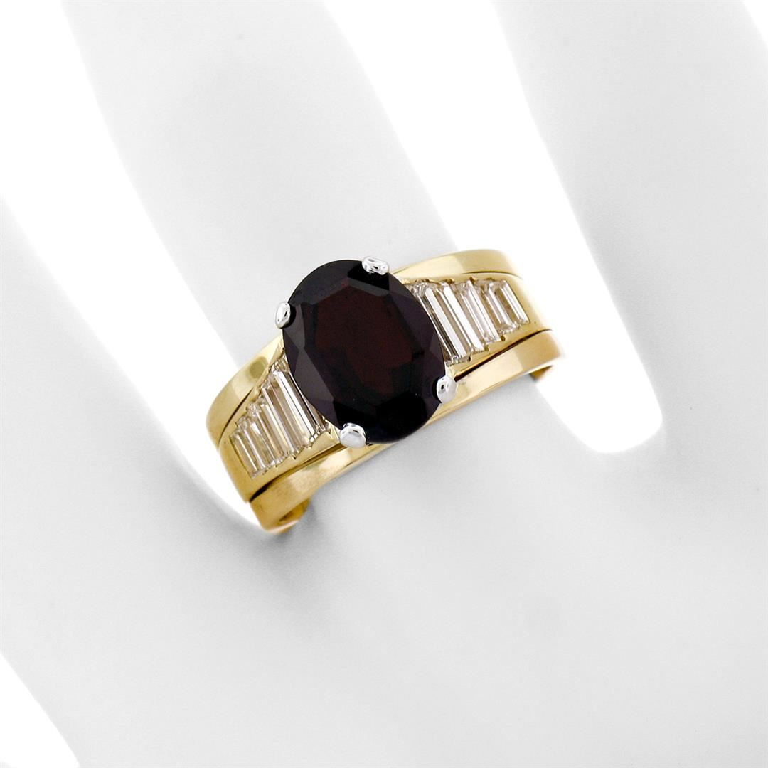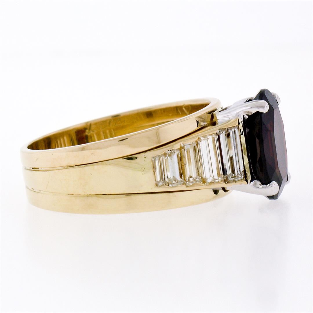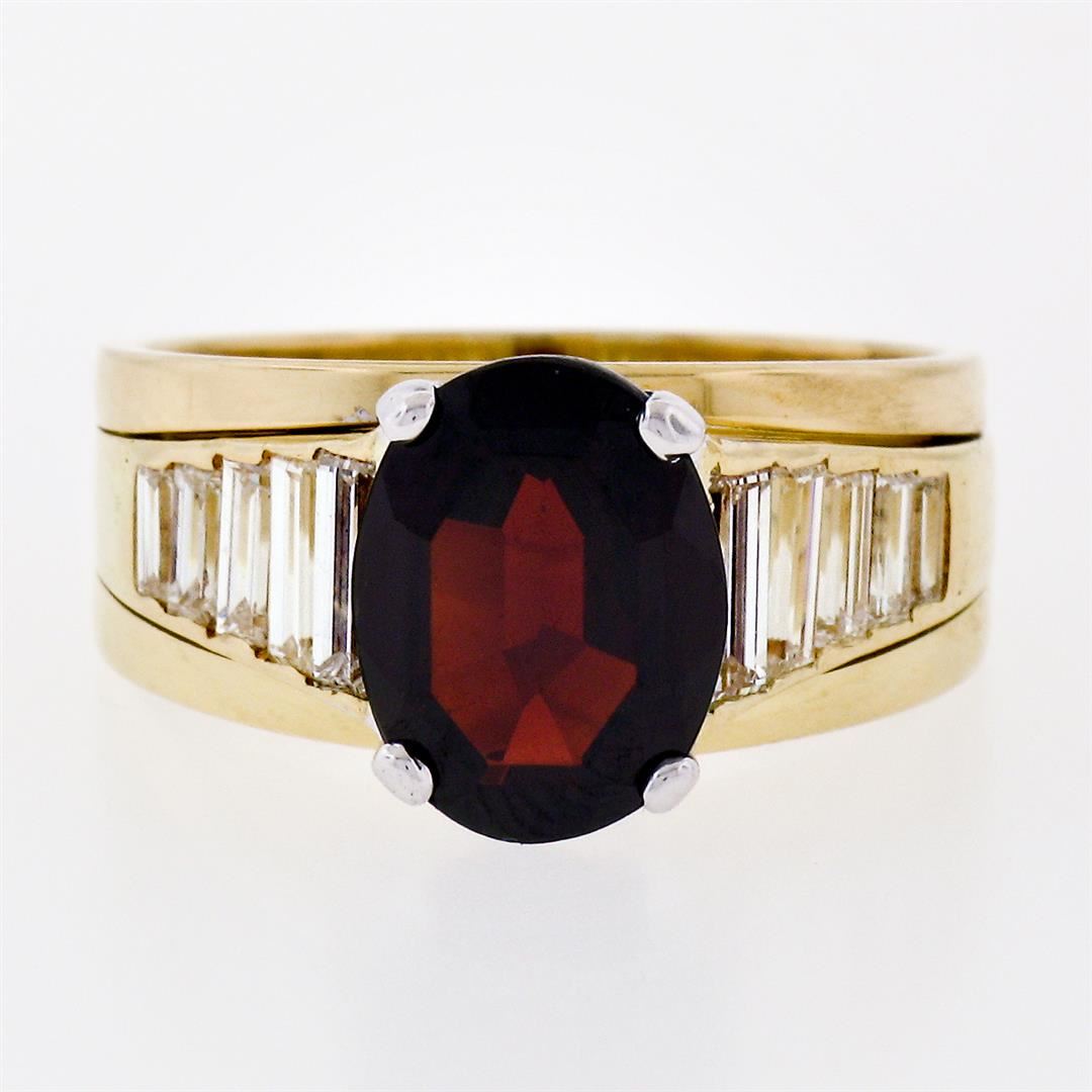 An estate solid 18k yellow gold solitaire ring, featuring 1 oval cut natural garnet (10.0x7.60mm), accented with 10 bagutte cut natural diamonds (G/H- VVS1/VVS2; 1.18ctw). The ring is size 6.5, weighs a total of 6.27 grams, and measures 8.35mm wide.