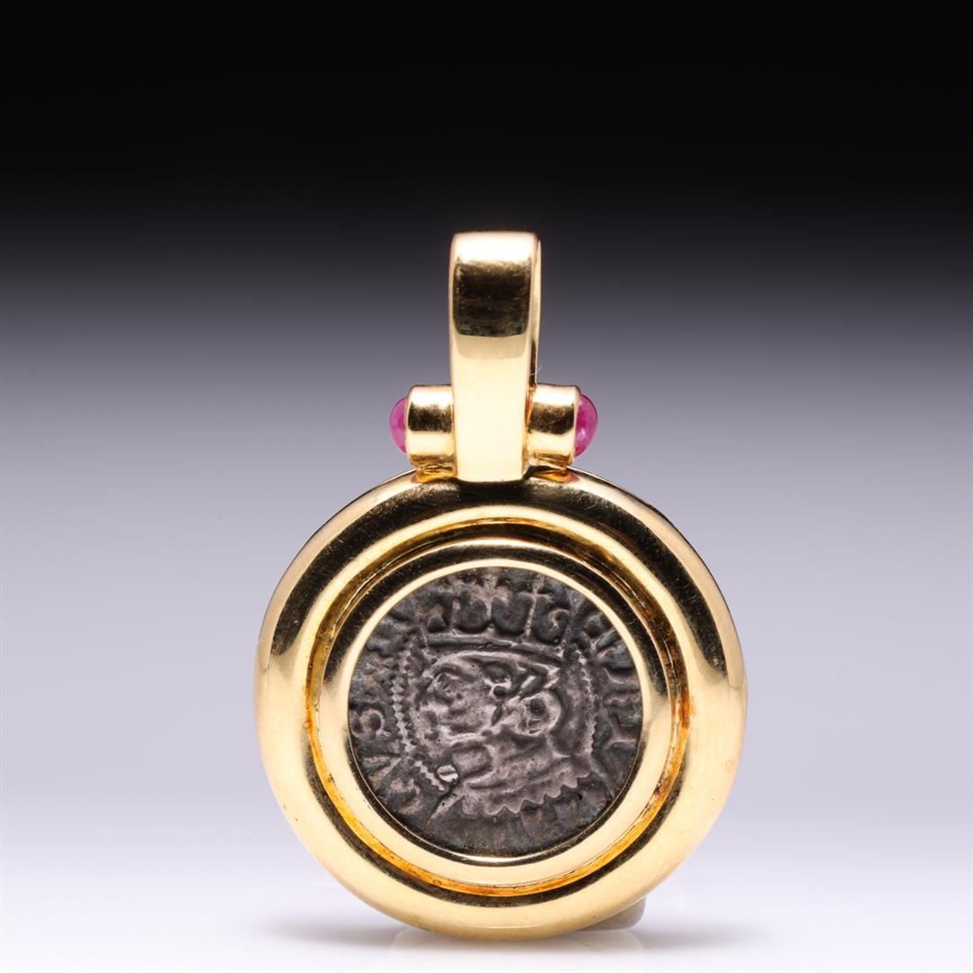 18k yellow gold pendant set with twin rubies flaking the bail and ancient silver Armenian coin to center, the coin from the reign of a Medieval Armenian Christian King who sent Knights to the Crusades, the pendant marked 18k; 11.7 g, 1 1/2" x 1" (approx.