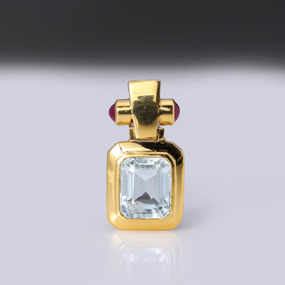 18k yellow gold pendant with rubies and emerald cut topaz, pendant marked 750 with hallmark; gross weight 7.6 g, 1" x 1/2" (approx.)