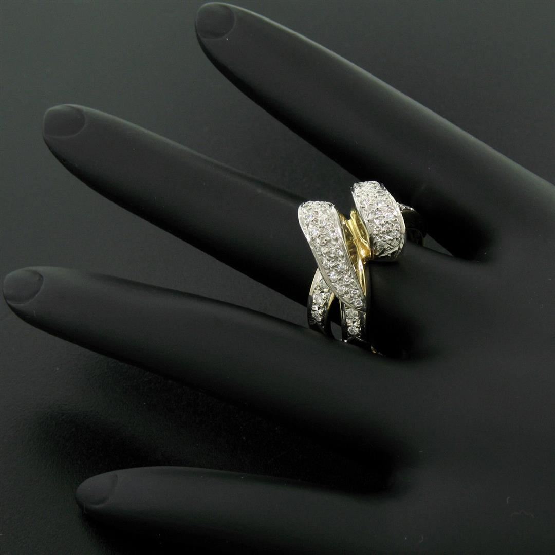 18K Yellow Gold & Platinum .46ctw Pave Set Diamond Open Swirl Cocktail Ring Sz 7. Please see photos and description for all available information. An estate solid 18k yellow gold and platinum swirl cocktail ring, with 46 round brilliant cut natural diamonds (G- VS1; 0.46ctw). The ring is size 7.0, weighs a total of 14.36 grams, and measures 15.0mm wide.