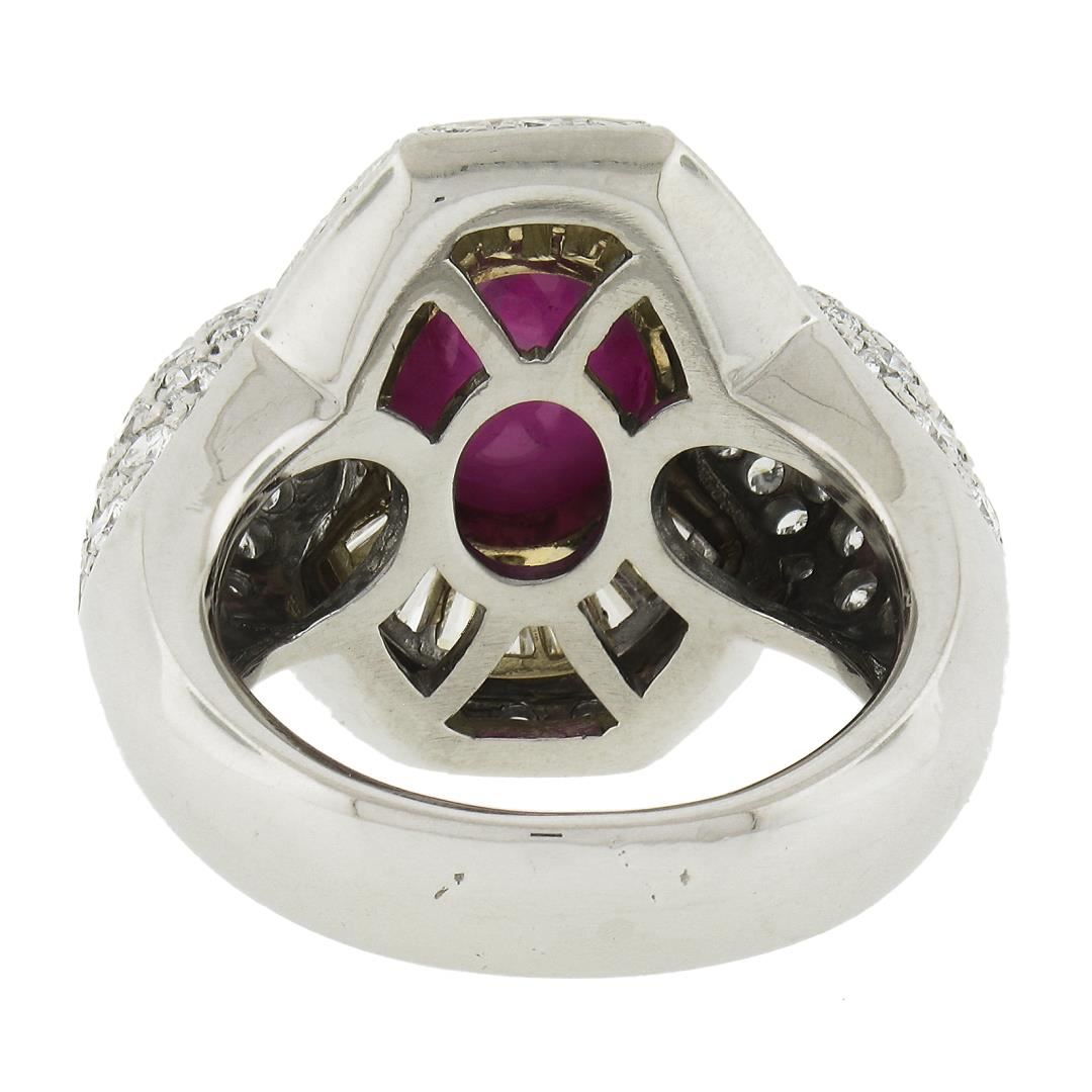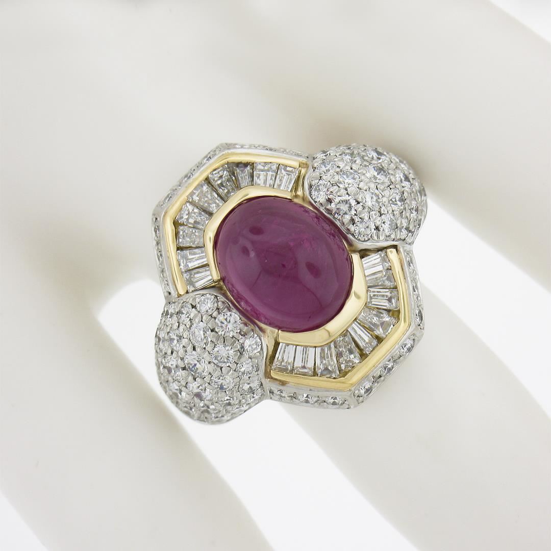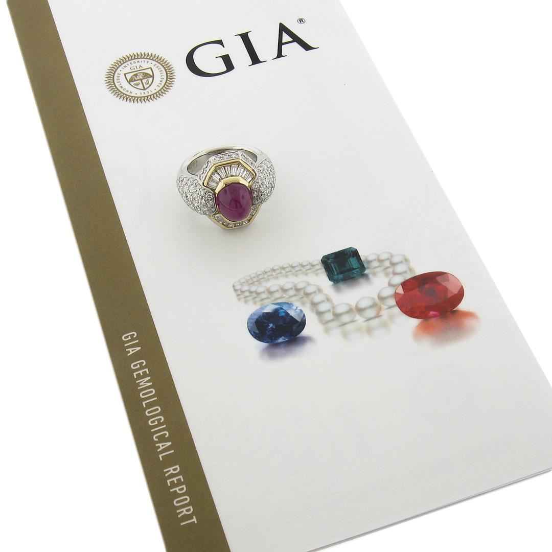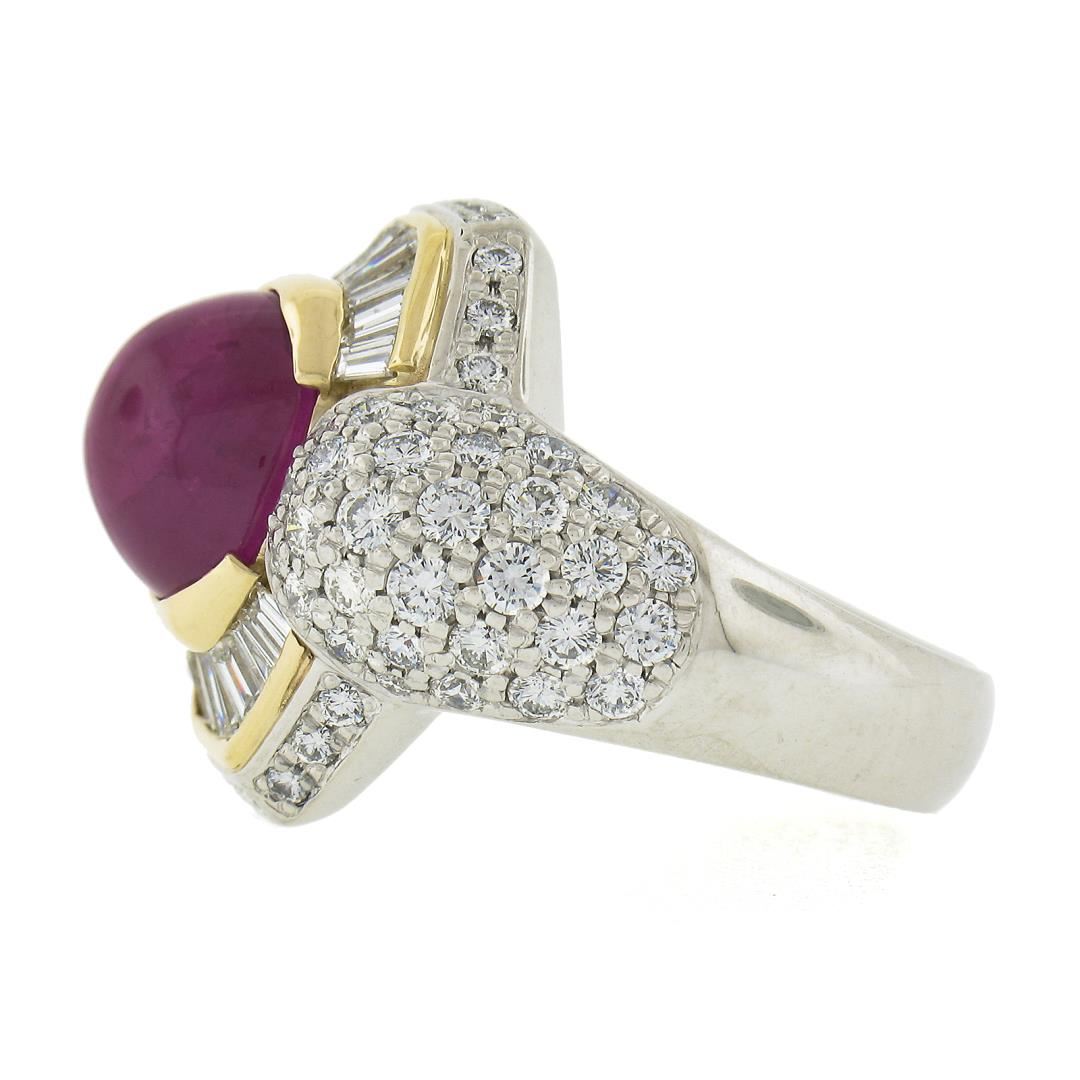 A solid 18k yellow gold & platinum cocktail ring, with 1 GIA graded oval cabochon cut natural ruby (5.81ct), and numerous of baguette & round cut natural diamonds (F-H - VS1/VS2 ; 2.70ctw). The ring is size 7.0, weighs a total of 22.14 grams, and measures 20.8mm wide. Comes with all original relevant certifications.