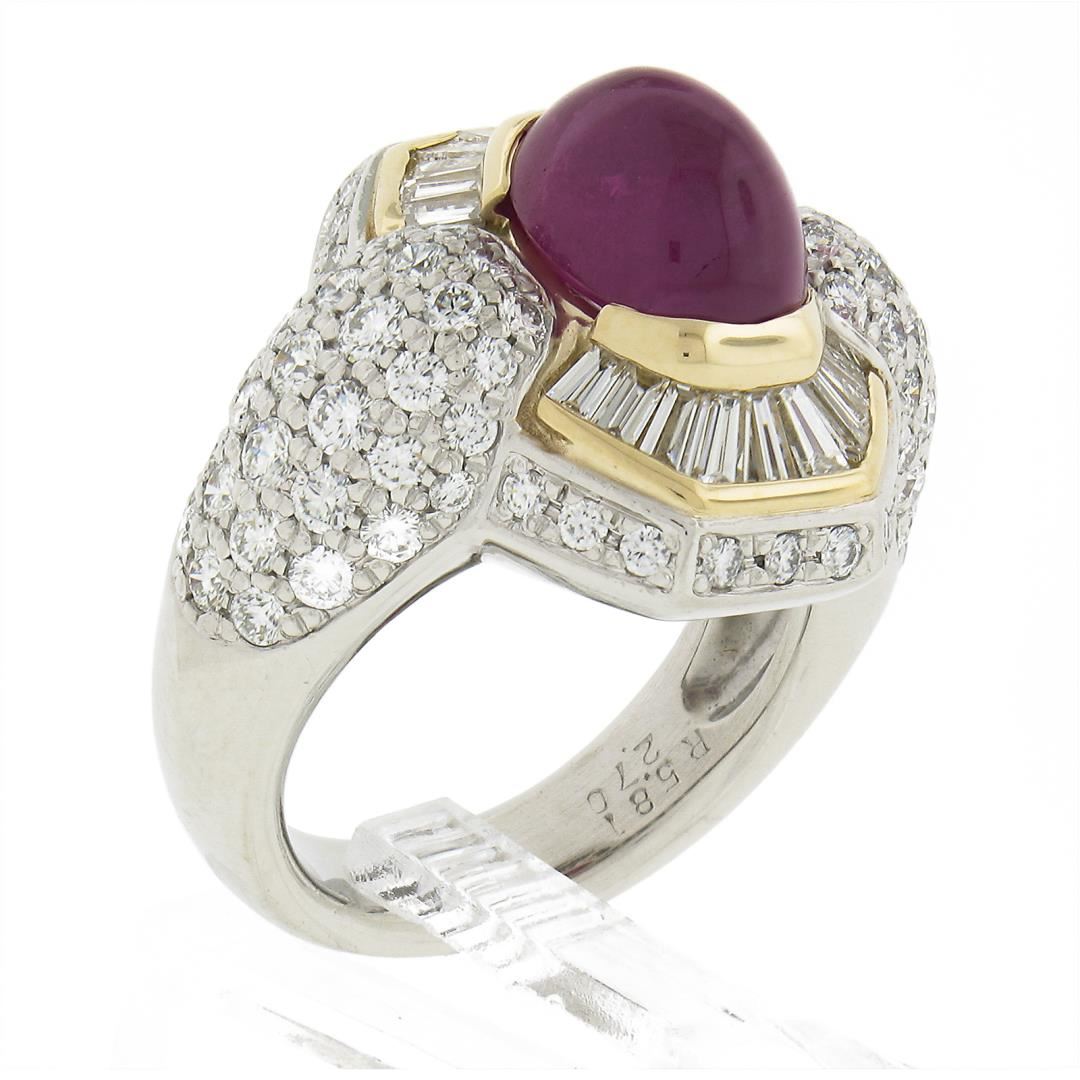 A solid 18k yellow gold & platinum cocktail ring, with 1 GIA graded oval cabochon cut natural ruby (5.81ct), and numerous of baguette & round cut natural diamonds (F-H - VS1/VS2 ; 2.70ctw). The ring is size 7.0, weighs a total of 22.14 grams, and measures 20.8mm wide. Comes with all original relevant certifications.