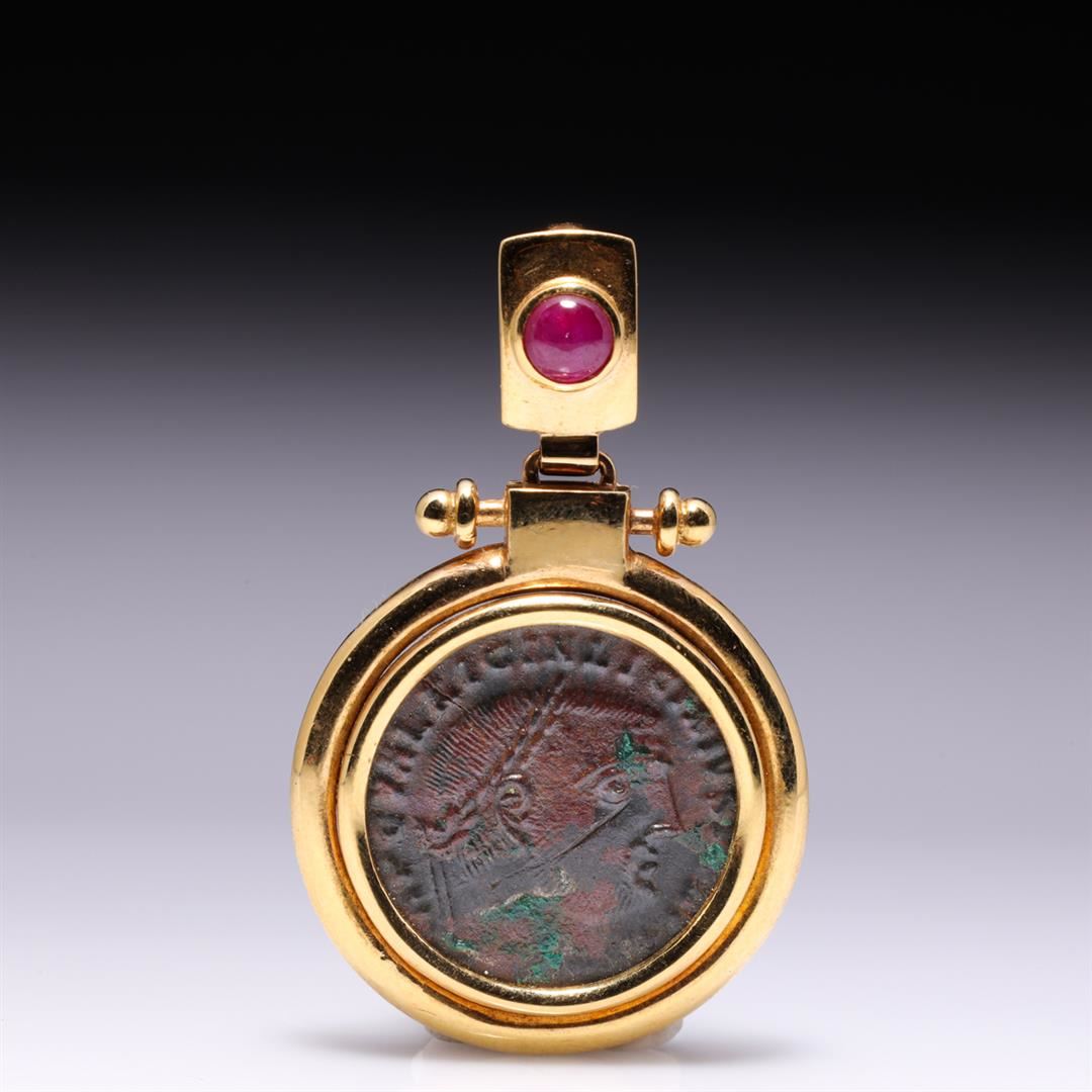 18K Yellow Gold Ruby & Ancient Roman Copper Coin Pendant containing one ruby weighing approximately 0.20 cts. Total weight is 12 gm. Estimated retail value $2,100.