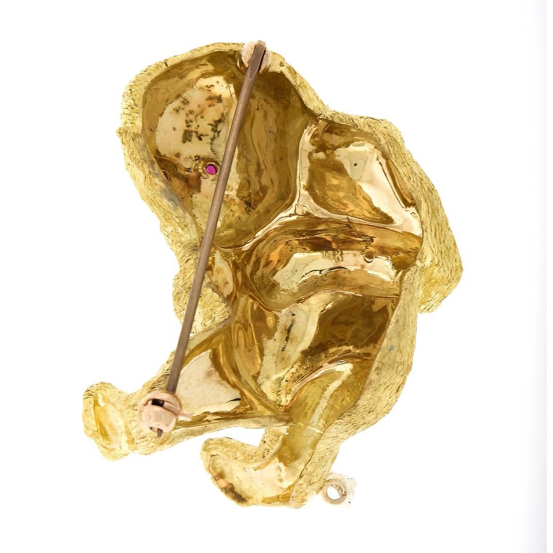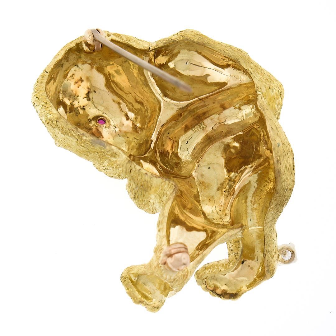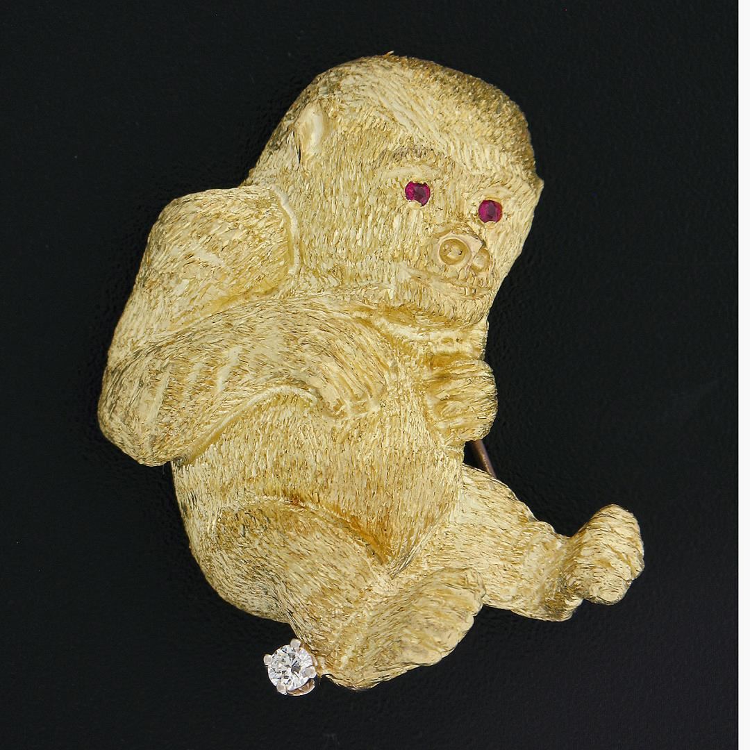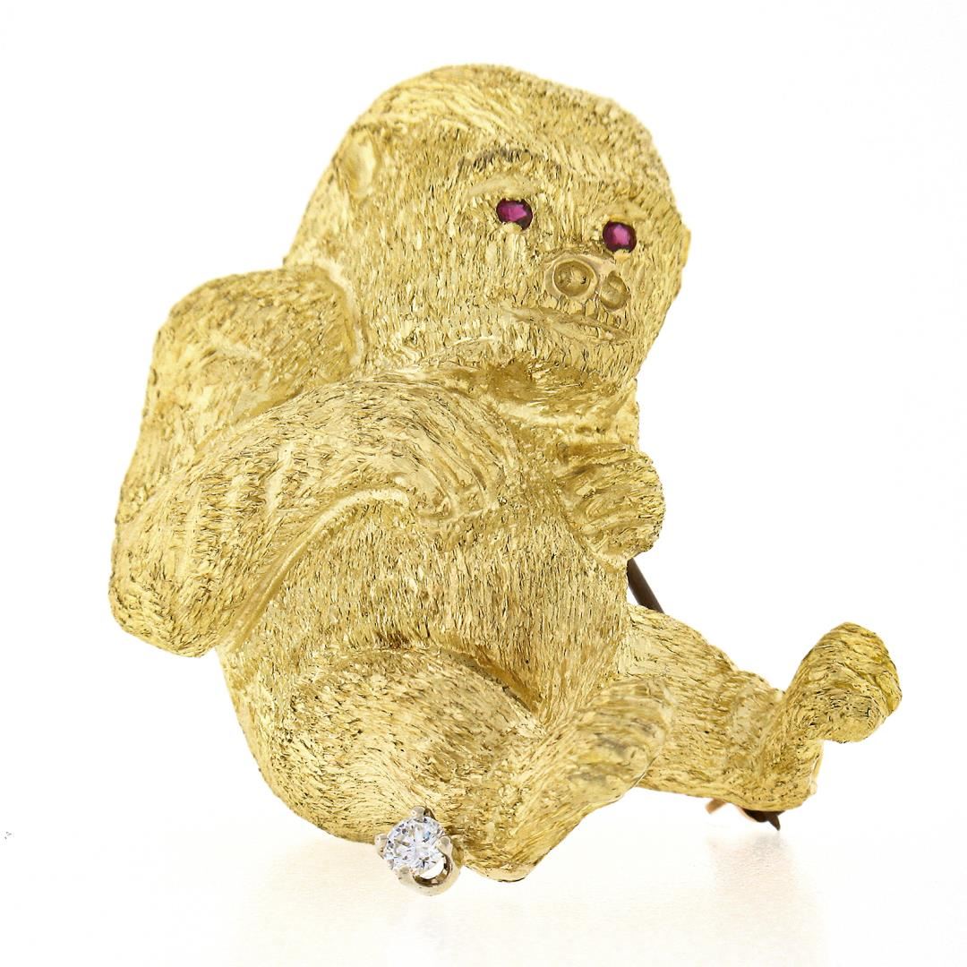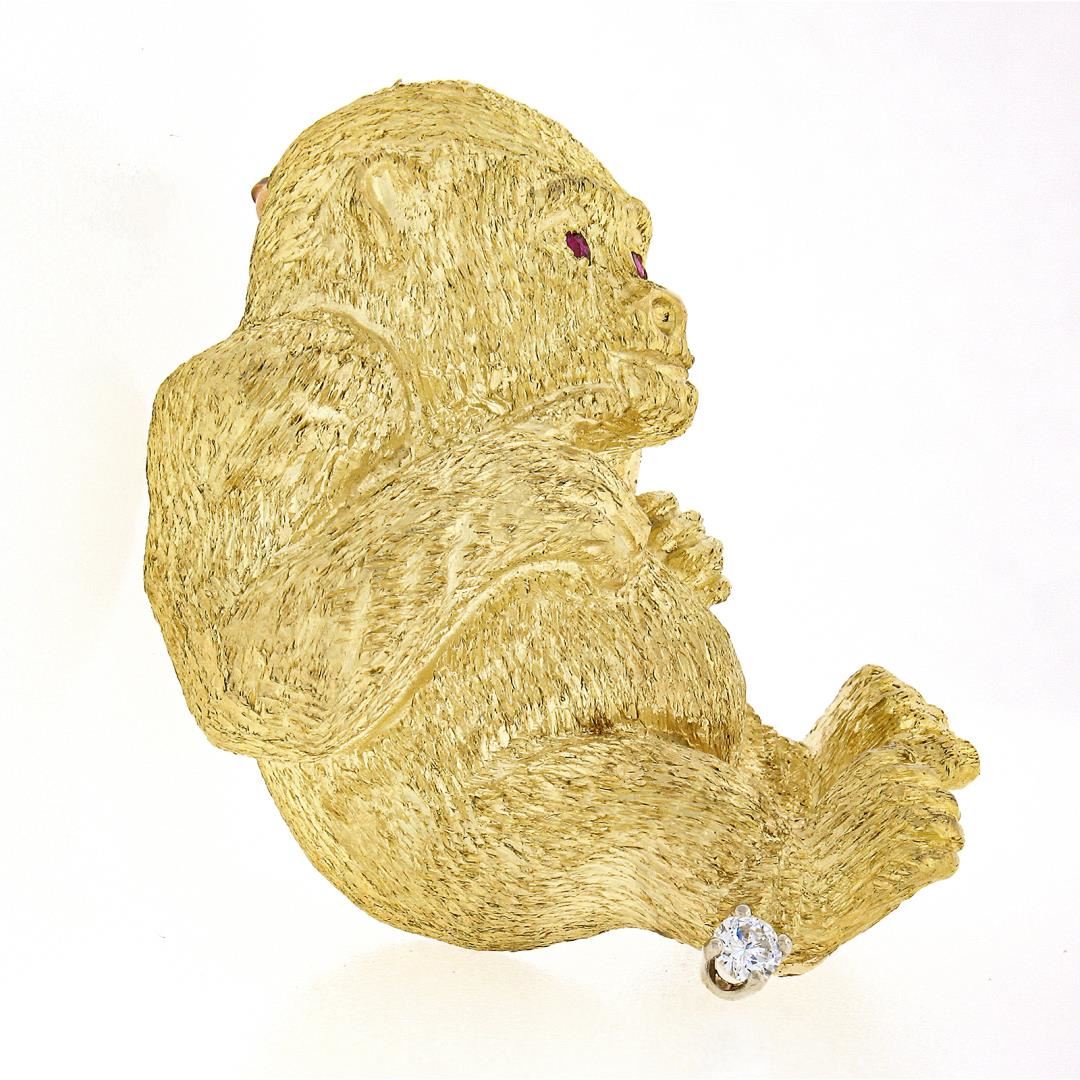 a solid 18k yellow gold gorilla brooch. with 2 round brilliant cut natural rubies (0.04ctw), and 1 round brilliant cut natural diamond (G - VS2 ; 0.06ct ). Measures 31.90x36.60mm and weighs a total of 22.72 grams.