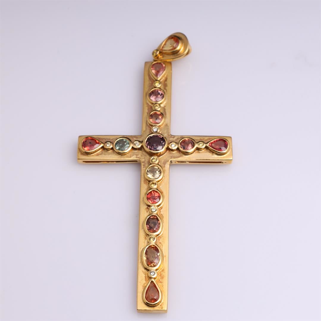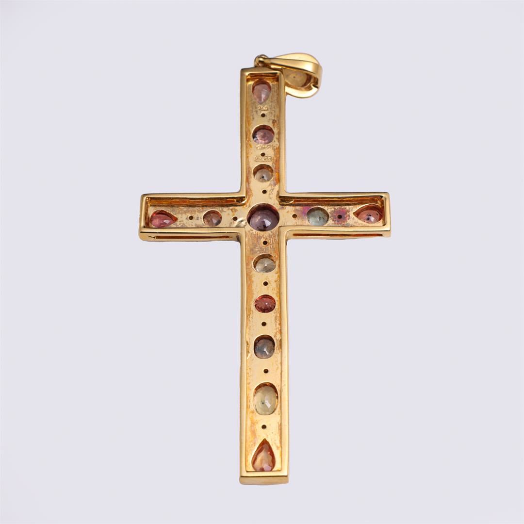 A very fine Carlo Rici designed 18k yellow gold cross pendant, bezel set with 14 sapphires in various colors on a matte brushed ground, each spaced with a bezel set diamond; stamped CR750; gross weight 21.3 g, 3 3/8" x 1 5/8" (approx.)