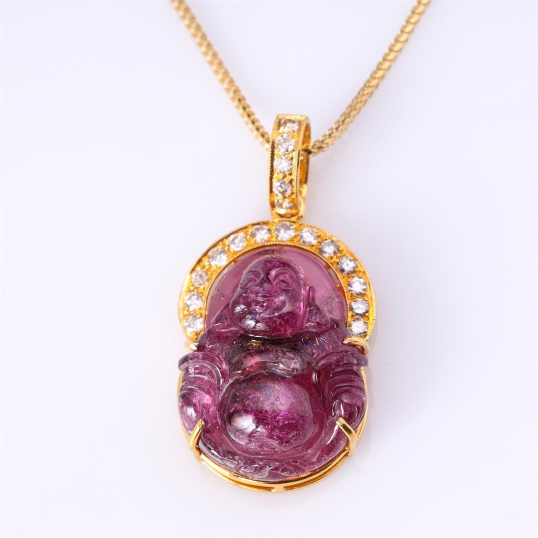 An exceptional pink tourmaline carving of Budai mounted in 18k yellow gold with a halo set with 13 diamonds and swivel bail also with diamonds, complete with an Italian made 18k yellow gold chain; gross weight 16.8 g, the pendant 1 1/2" x 3/4", the chain