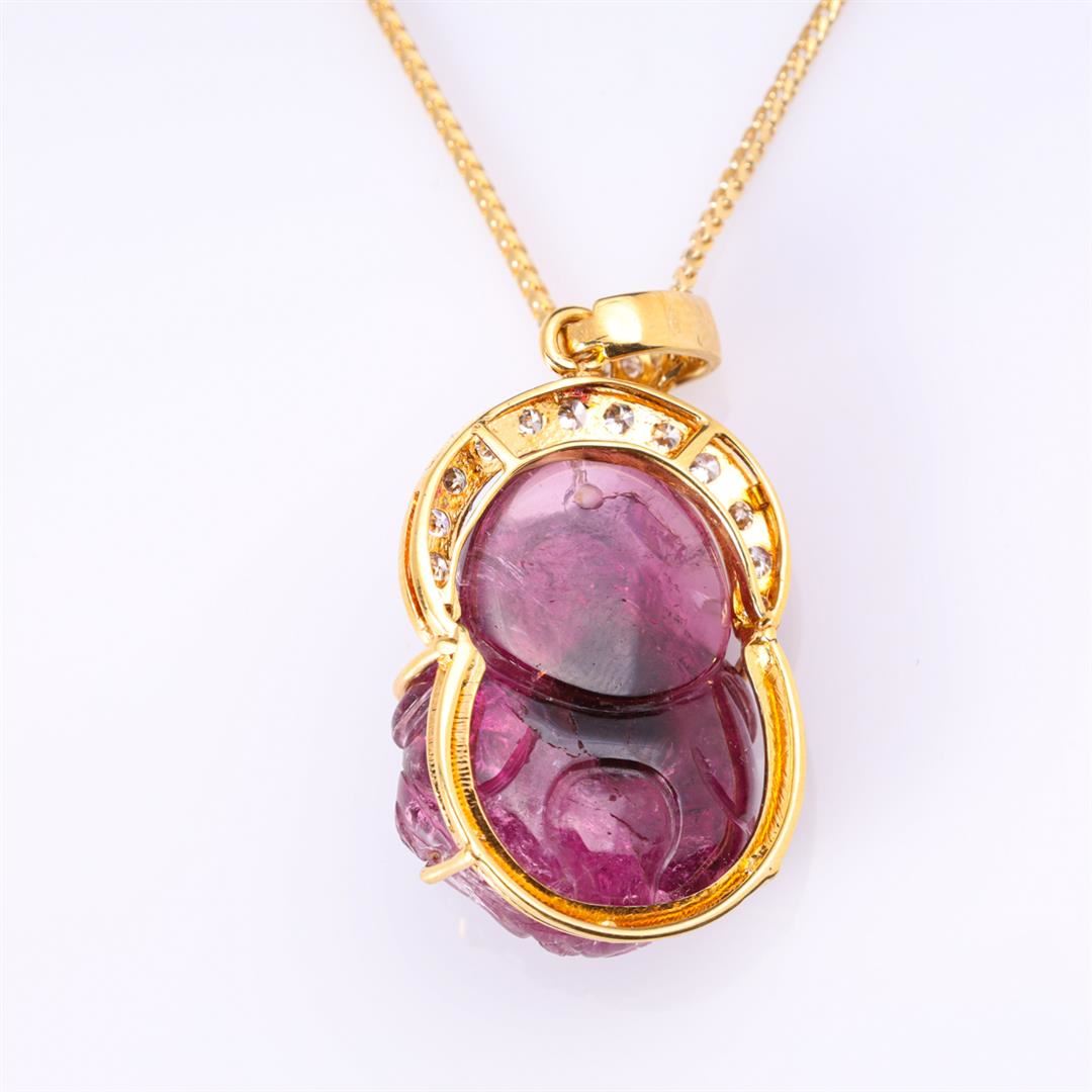 18K Yellow Gold Tourmaline & Diamond Pendant containing eighteen round cut brilliant diamonds weighing approximately 0.34 cts. Total weight of 16.8 gm. Estimated retail value $3,800.