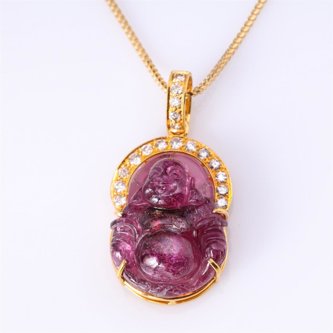 18K Yellow Gold Tourmaline & Diamond Pendant containing eighteen round cut brilliant diamonds weighing approximately 0.34 cts. Total weight of 16.8 gm. Estimated retail value $3,800.