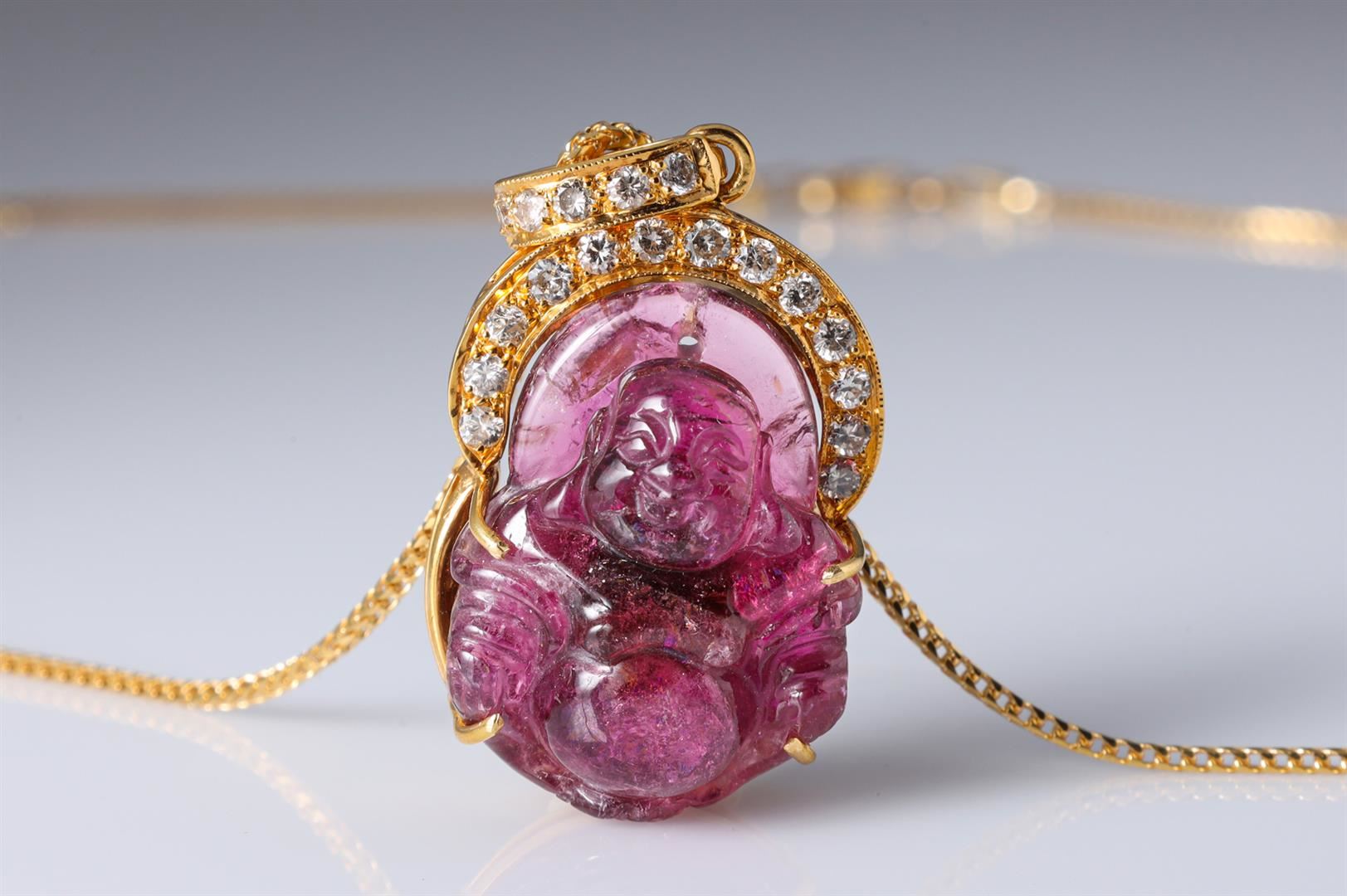 18K Yellow Gold Tourmaline & Diamond Pendant containing eighteen round cut brilliant diamonds weighing approximately 0.34 cts. Total weight of 16.8 gm. Estimated retail value $3,800.