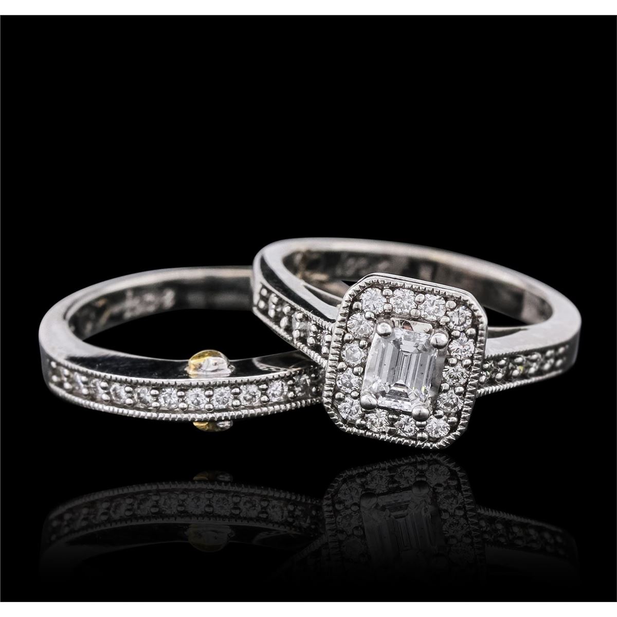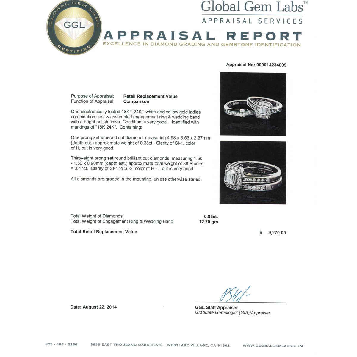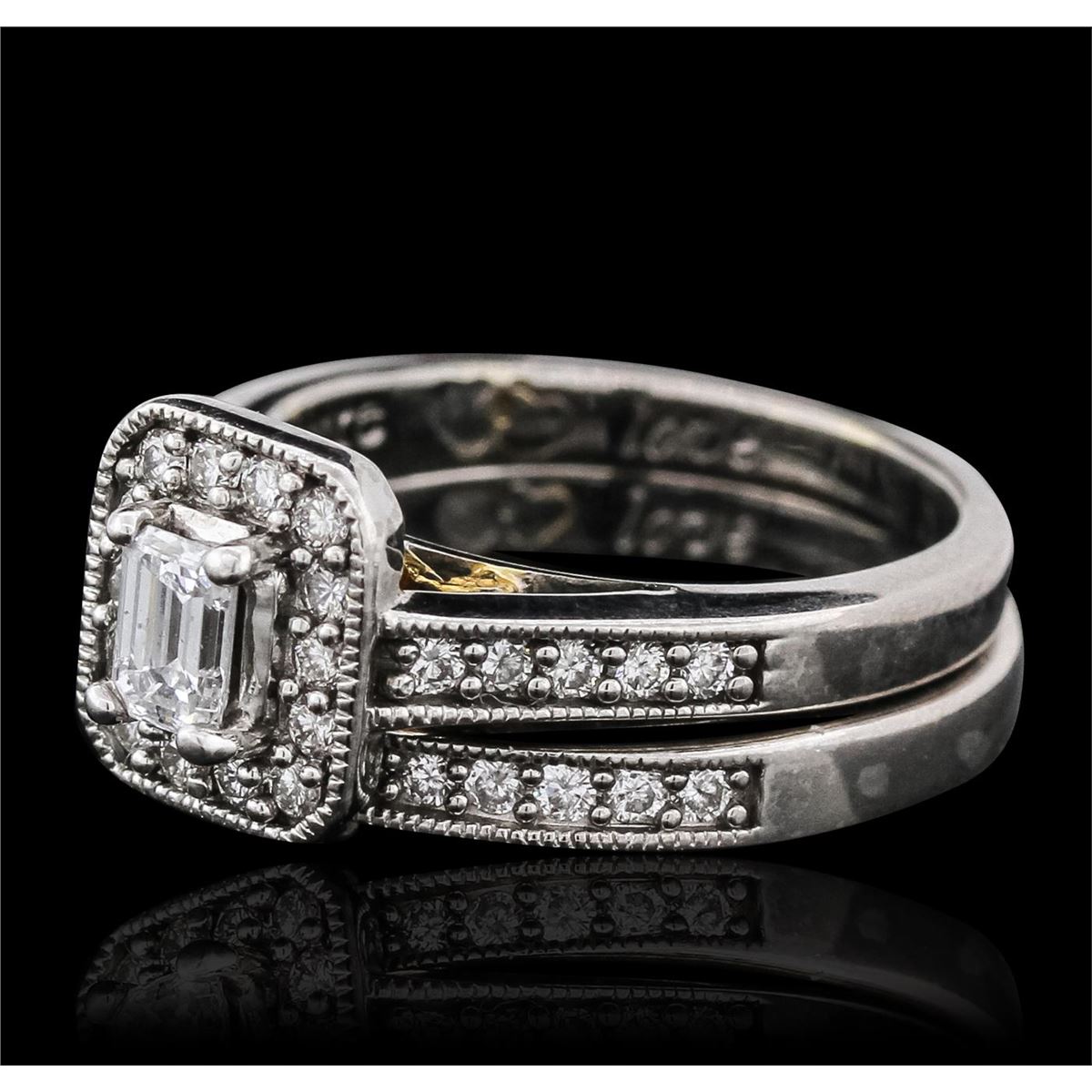 One electronically tested 18KT-24KT white and yellow gold ladies combination cast & assembled engagement ring & wedding band with a bright polish finish. Identified with markings of "18K 24K". Condition is very good. Containing: One prong set emerald cut diamond, measuring 4.98 x 3.53 x 2.37mm (depth est.) approximate weight of 0.38ct. Clarity: SI-1. Color: H, Cut is Very Good. Thirty-Eight prong set round brilliant cut diamonds, measuring 1.50 - 1.50 x 0.90mm (depth est.) approximate total weight of 38 Stones = 0.47ct. Clarity: SI-1 to SI-2. Color: H - I, Cut is Very Good. All diamonds are graded in the mounting, unless otherwise stated. Total Weight of Diamonds 0.85ct. Total Weight of Engagement Ring & Wedding Band 12.70 grams. GGL Appraised at $9,270.00.