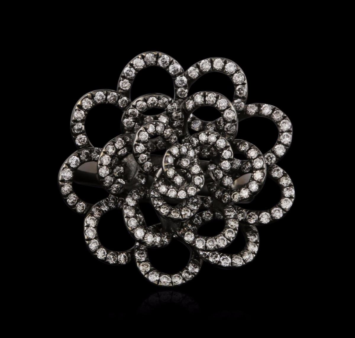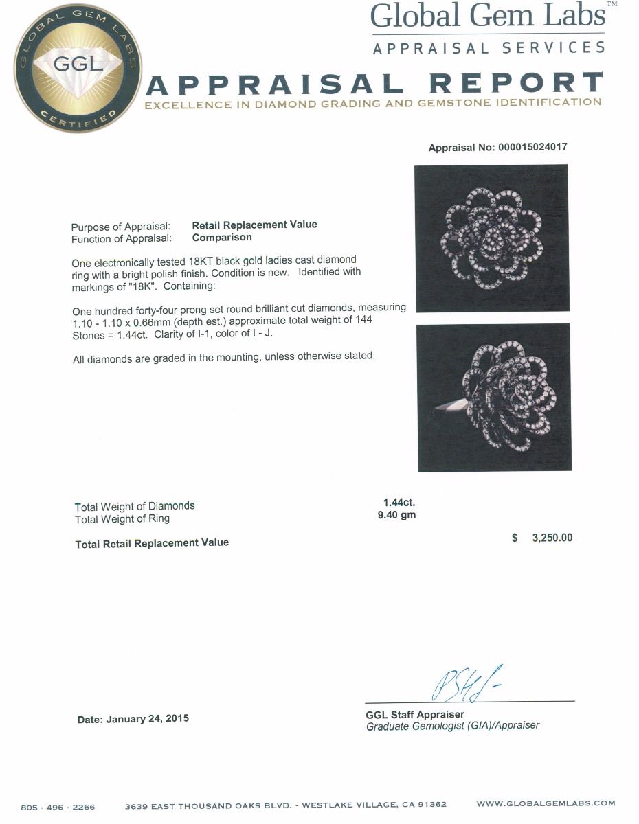 One electronically tested 18KT black gold ladies cast diamond ring with a bright polish finish. Identified with markings of "18K". Condition is new. Containing: One Hundred Forty-Four prong set round brilliant cut diamonds, measuring 1.10 - 1.10 x 0.66mm (depth est.) approximate total weight of 144 Stones = 1.44ct. Clarity: I-1. Color: I - J. All diamonds are graded in the mounting, unless otherwise stated. Total Weight of Diamonds 1.44ct. Total Weight of Ring 9.40 grams. GGL Appraised at $3,250.00.