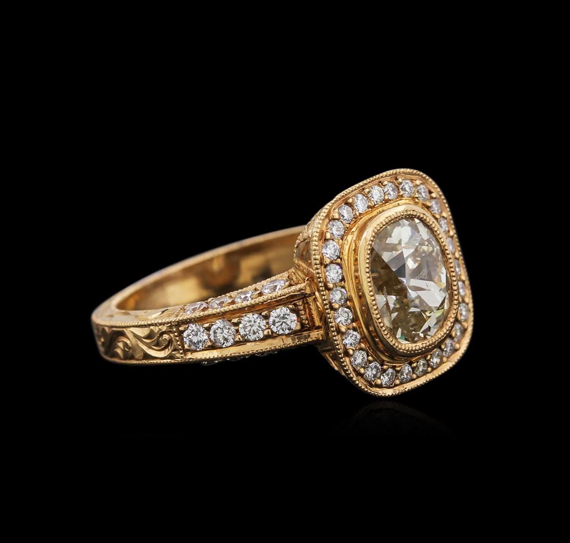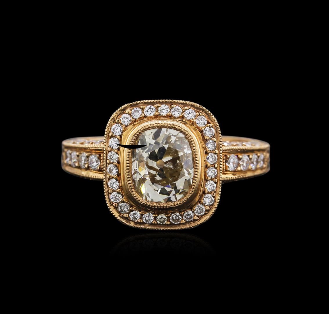 One electronically tested 14-18KT rose gold ladies cast diamond engagement ring with a bright polish finish. Identified with markings of "18K". Condition is new. Containing: One bezel set old mine cut diamond, measuring 7.80 - 6.50 x 4.43mm (depth est.) approximate weight of 1.38ct. Clarity: SI-1. Color: K. Fifty prong set round brilliant cut diamonds, measuring 1.50 - 1.20 x 0.81mm (depth est.) approximate total weight of 50 Stones = 0.45ct. Clarity: SI-1 to SI-2. Color: F, Cut is Good. Diamonds are graded in the mounting, unless otherwise stated. Total Weight of Diamonds 1.83ct. Total Weight of Engagement Ring 7.20 grams. GGL Appraised at $15,890.00.