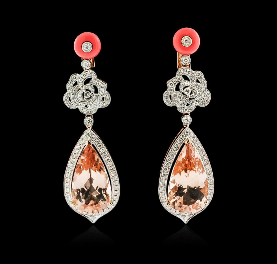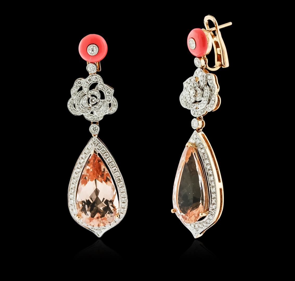 One pair of earrings featuring: 18KT rose gold weighing a total of 15.10 grams containing two morganite weighing a total of 16.88 carats and diamonds weighing a total of 1.47 carats.