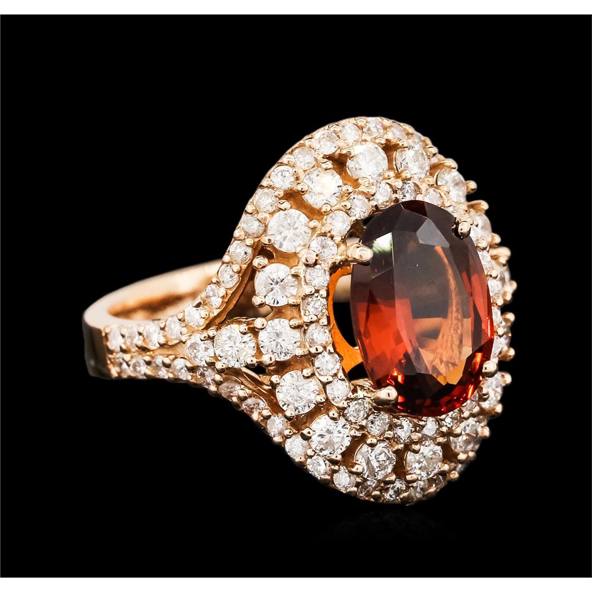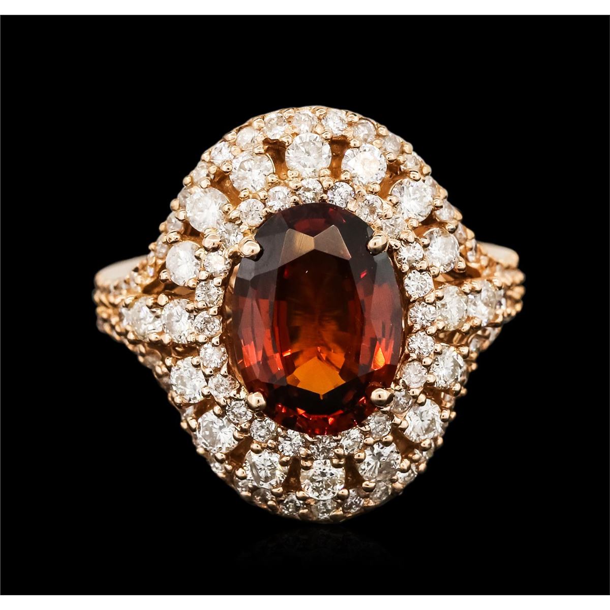 One electronically tested 18KT rose gold ladies cast garnet and diamond ring with a bright polish finish. The featured garnet is set within tiered diamond bezels supported by diamond set shoulders, completed by a three and one-half millimeter wide band. Identified with markings of "18K". Condition is new, good workmanship. Containing: One prong set oval mixed cut natural hessonite garnet, measuring 11.00 x 7.50 x 4.40mm, 6% bulge factor, approximate weight of 3.31ct., clarity is eye clean, dark, slightly brownish, orange color, (GIA O 7/2), cut is good. Transmitting light with no distortion, transparent. Refractive index testing results of 1.77. This is a conclusive result for garnet. Graded in the setting. Twenty prong set round brilliant cut diamonds, measuring 2.20 - 2.10 x 1.29mm (depth est.) approximate total weight of 20 Stones = 0.82ct. Graded in the setting. Clarity: SI-2 to I-1. Color: G - I Seventy-Eight prong set round brilliant cut diamonds, measuring 1.50 - 1.30 x 0.84mm (depth est.) approximate total weight of 78 Stones = 0.88ct. Graded in the setting. Clarity: SI-2 to I-2. Color: G - I. Total Weight of Colored Stones 3.31ct. Total Weight of Diamonds 1.70ct. Total Weight of Ring 9.00 grams. AIG Appraised at $6,690.00.