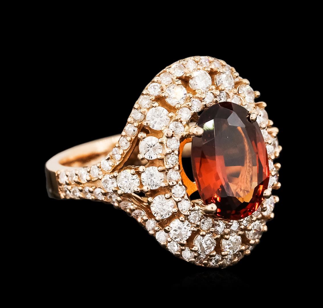 One electronically tested 18KT rose gold ladies cast garnet and diamond ring with a bright polish finish. The featured garnet is set within tiered diamond bezels supported by diamond set shoulders, completed by a three and one-half millimeter wide band. Identified with markings of "18K". Condition is new, good workmanship. Containing: One prong set oval mixed cut natural hessonite garnet, measuring 11.00 x 7.50 x 4.40mm, 6% bulge factor, approximate weight of 3.31ct., clarity is eye clean, dark, slightly brownish, orange color, (GIA O 7/2), cut is good. Transmitting light with no distortion, transparent. Refractive index testing results of 1.77. This is a conclusive result for garnet. Graded in the setting. Twenty prong set round brilliant cut diamonds, measuring 2.20 - 2.10 x 1.29mm (depth est.) approximate total weight of 20 Stones = 0.82ct. Graded in the setting. Clarity: SI-2 to I-1. Color: G - I Seventy-Eight prong set round brilliant cut diamonds, measuring 1.50 - 1.30 x 0.84mm (depth est.) approximate total weight of 78 Stones = 0.88ct. Graded in the setting. Clarity: SI-2 to I-2. Color: G - I. Total Weight of Colored Stones 3.31ct. Total Weight of Diamonds 1.70ct. Total Weight of Ring 9.00 grams. AIG Appraised at $6,690.00.