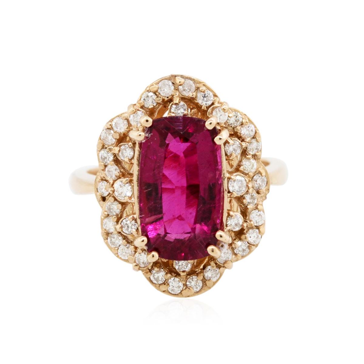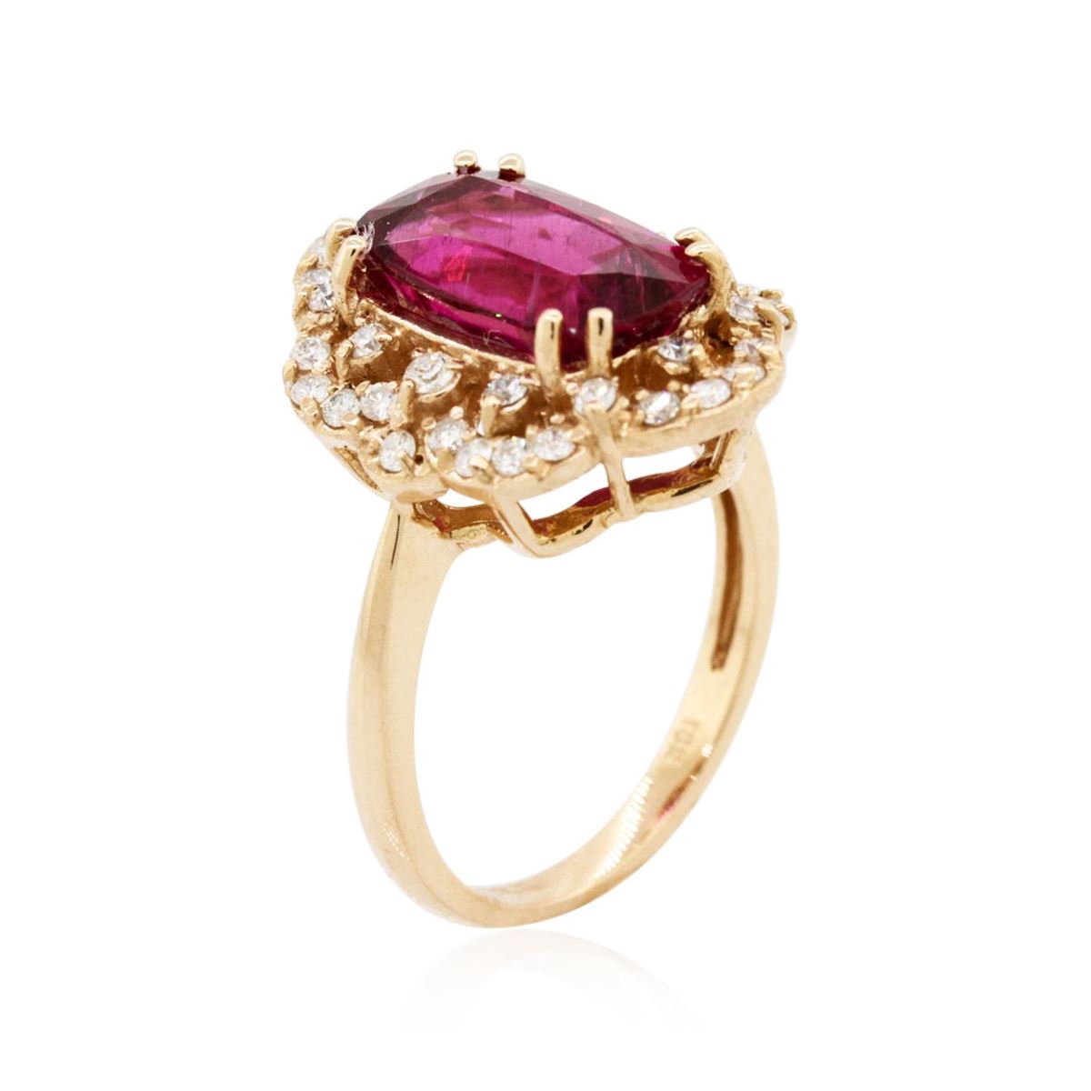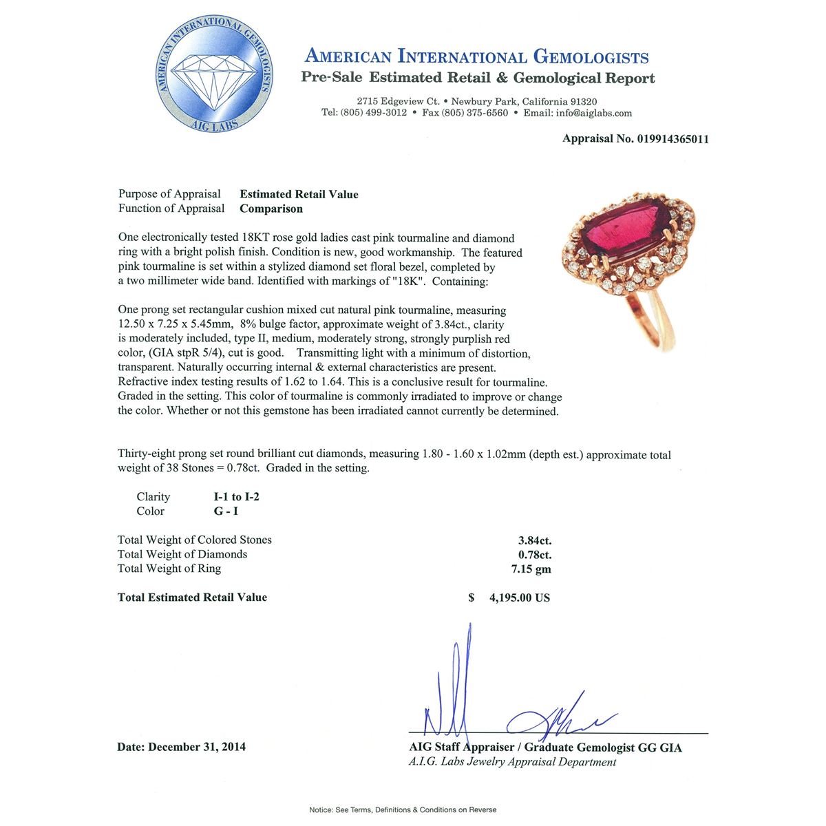 One electronically tested 18KT rose gold ladies cast pink tourmaline and diamond ring with a bright polish finish. The featured pink tourmaline is set within a stylized diamond set floral bezel, completed by a two millimeter wide band. Identified with markings of "18K". Condition is new, good workmanship. Containing: One prong set rectangular cushion mixed cut natural pink tourmaline, measuring 12.50 x 7.25 x 5.45mm, 8% bulge factor, approximate weight of 3.84ct., clarity is moderately included, type II, medium, moderately strong, strongly purplish red color, (GIA stpR 5/4), cut is good. Transmitting light with a minimum of distortion, transparent. Naturally occurring internal & external characteristics are present. Refractive index testing results of 1.62 to 1.64. This is a conclusive result for tourmaline. Graded in the setting. This color of tourmaline is commonly irradiated to improve or change the color. Whether or not this gemstone has been irradiated cannot currently be determined. Thirty-Eight prong set round brilliant cut diamonds, measuring 1.80 - 1.60 x 1.02mm (depth est.) approximate total weight of 38 Stones = 0.78ct. Graded in the setting. Clarity: I-1 to I-2. Color: G - I. Total Weight of Colored Stones 3.84ct. Total Weight of Diamonds 0.78ct. Total Weight of Ring 7.15 grams. AIG Appraised at $4,195.00.