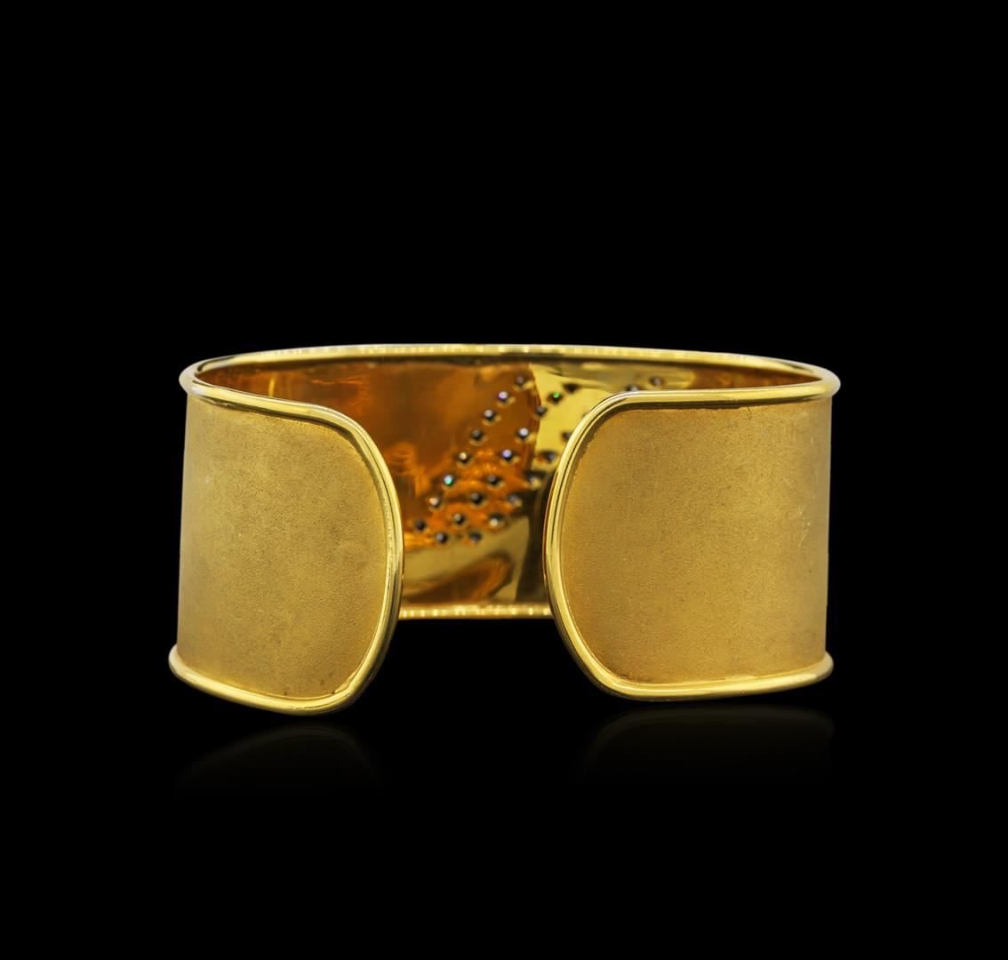 One electronically tested 18KT yellow and white gold ladies cast diamond cuff bracelet with a brushed finish. Identified with markings of "750". Condition is very good. Containing: Twenty-Seven prong set round brilliant cut diamonds, measuring 1.60 - 1.40 x 0.90mm (depth est.) approximate total weight of 27 Stones = 0.33ct. Clarity: SI-1 to SI-2. Color: I - J, Cut is Good. All diamonds are graded in the mounting, unless otherwise stated. Total Weight of Diamonds 0.33ct. Total Weight of Cuff Bracelet 41.00 grams. GGL Appraised at $8,005.00.