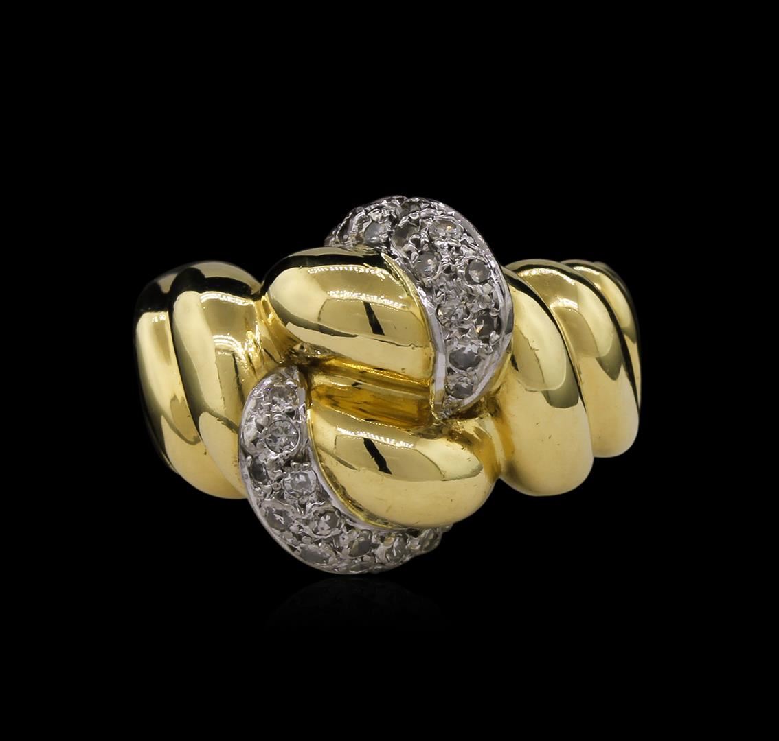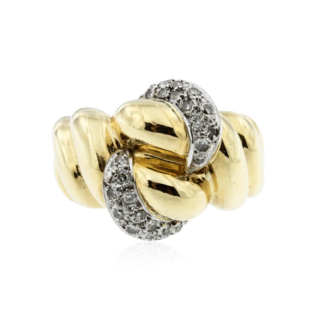 One electronically tested 18KT yellow and white gold ladies cast & assembled diamond ring with a bright polish finish. The ring features numerous yellow gold curvatures supported by two interlocking white gold diamond set curvatures, completed by a patterned three and one-half millimeter wide band. Identified with markings of "750". Condition is good. Containing: Thirty prong set single cut diamonds, measuring 1.50 - 1.40 x 0.87mm (depth est.) approximate total weight of 30 Stones = 0.43ct. Graded in the setting. Clarity: VS-2 to SI-2. Color: I - K. Total Weight of Diamonds 0.43ct. Total Weight of Ring 11.91 grams. AIG Appraised.