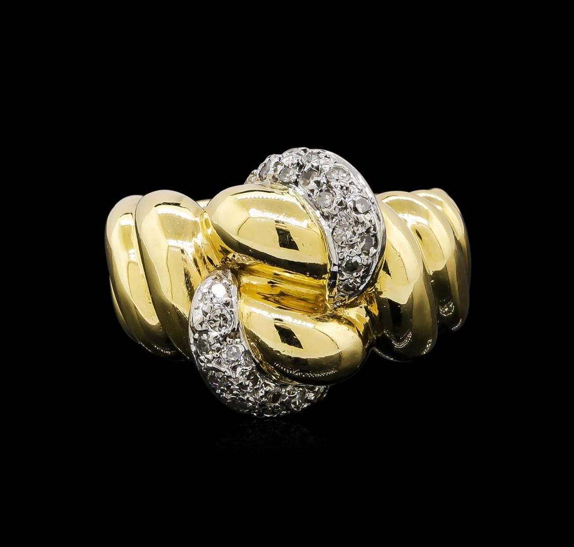 One electronically tested 18KT yellow and white gold ladies cast & assembled diamond ring with a bright polish finish. The ring features numerous yellow gold curvatures supported by two interlocking white gold diamond set curvatures, completed by a patterned three and one-half millimeter wide band. Identified with markings of "750". Condition is good. Containing: Thirty prong set single cut diamonds, measuring 1.50 - 1.40 x 0.87mm (depth est.) approximate total weight of 30 Stones = 0.43ct. Graded in the setting. Clarity: VS-2 to SI-2. Color: I - K. Total Weight of Diamonds 0.43ct. Total Weight of Ring 11.91 grams. AIG Appraised.