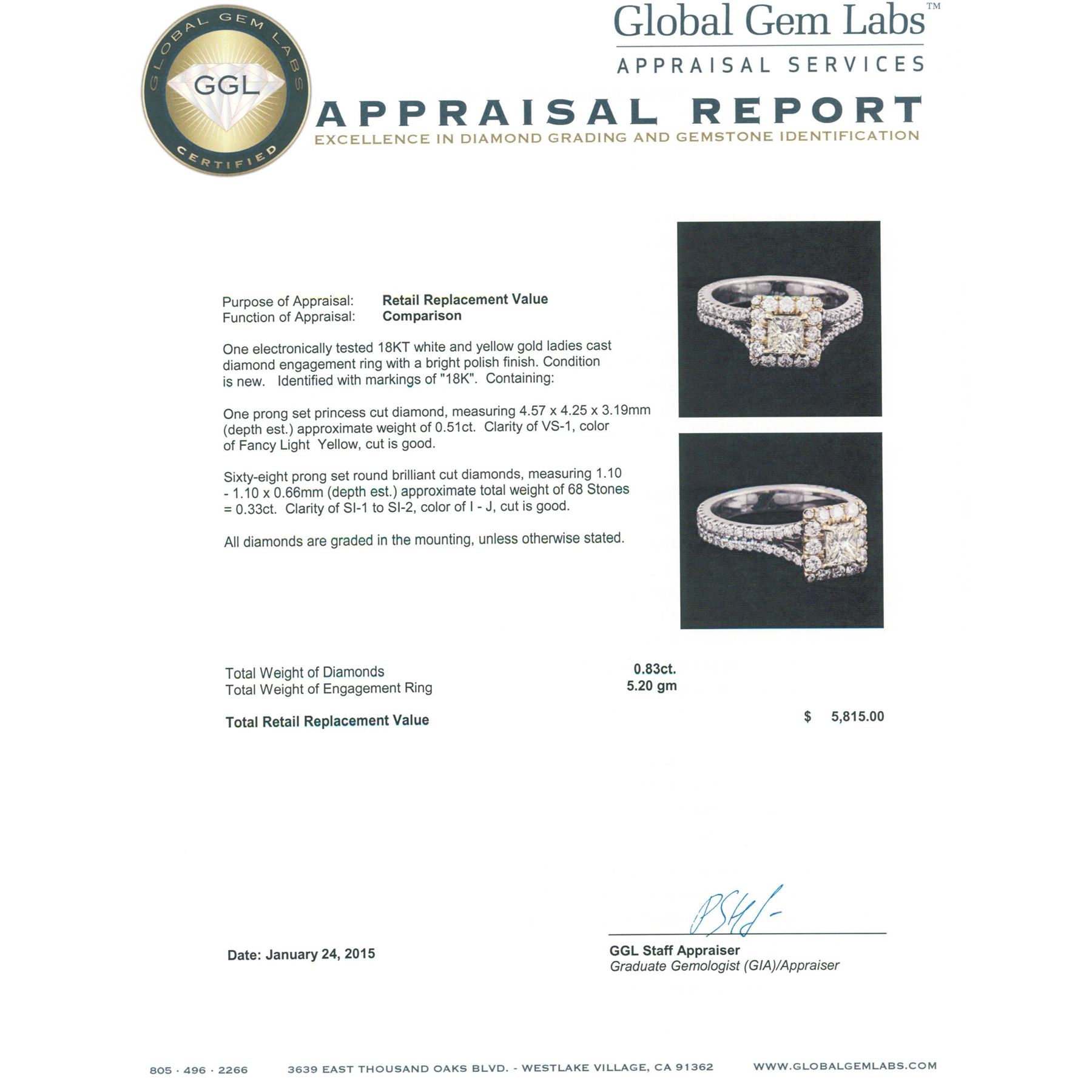 One electronically tested 18KT white and yellow gold ladies cast diamond engagement ring with a bright polish finish. Identified with markings of "18K". Condition is new. Containing: One prong set princess cut diamond, measuring 4.57 x 4.25 x 3.19mm (depth est.) approximate weight of 0.51ct. Clarity: VS-1, Cut is Good. Sixty-Eight prong set round brilliant cut diamonds, measuring 1.10 - 1.10 x 0.66mm (depth est.) approximate total weight of 68 Stones = 0.33ct. Clarity: SI-1 to SI-2. Color: I - J, Cut is Good. All diamonds are graded in the mounting, unless otherwise stated. Total Weight of Diamonds 0.83ct. Total Weight of Engagement Ring 5.20 grams. GGL Appraised at $5,815.00.