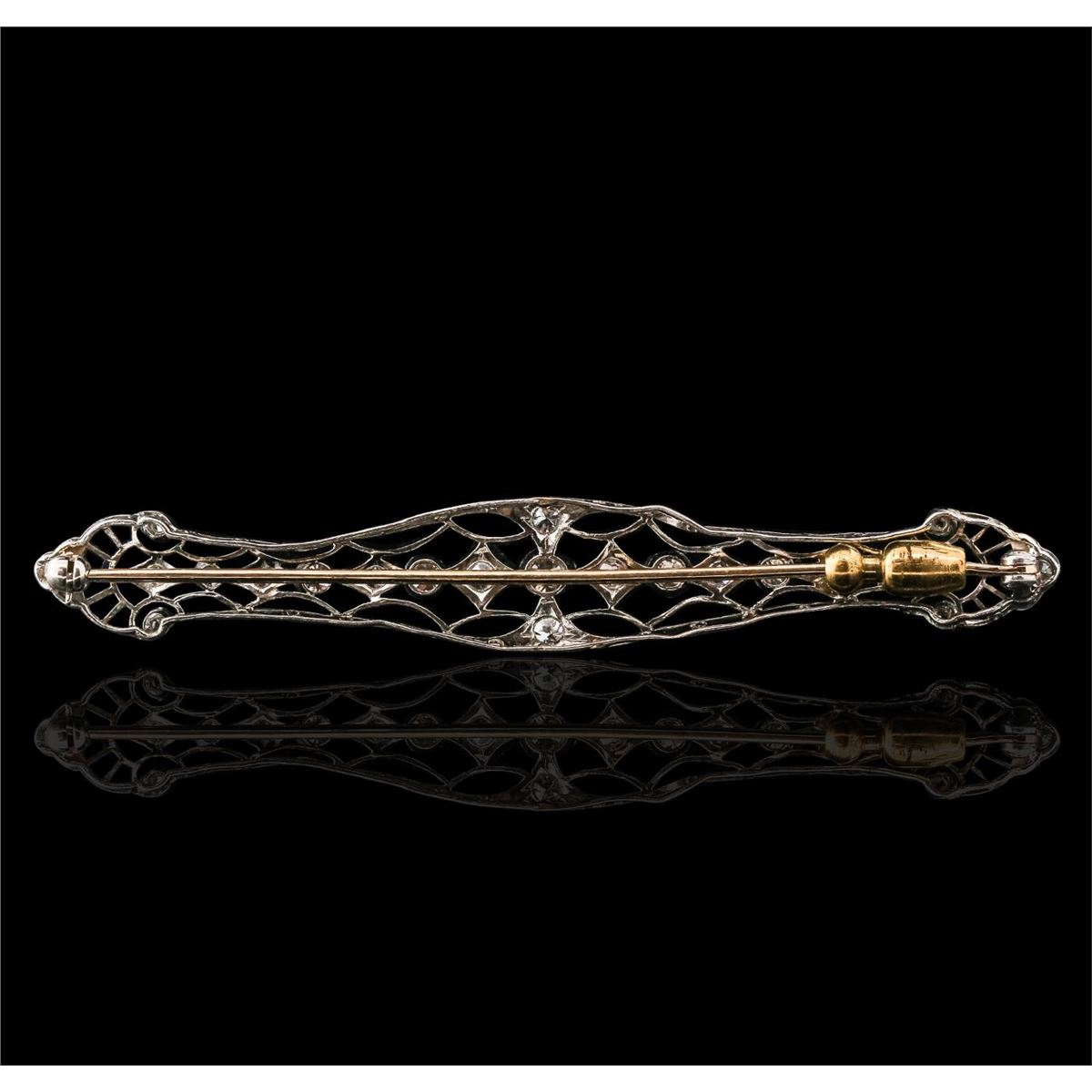 One electronically tested 18KT white and yellow gold ladies hand made antique pin with a antiqued finish. Condition is very good. Containing: One gypsy set Old European cut diamond, measuring 4.00 - 4.00 x 2.48mm (depth est.) approximate weight of 0.24ct. Clarity: SI-1. Color: H, Cut is Good. Ten gypsy set Old European cut diamonds, measuring 3.20 - 2.00 x 1.24mm (depth est.) approximate total weight of 10 Stones = 0.51ct. Clarity: SI-1 to SI-2. Color: H - J, Cut is Good. Ten prong set Old European cut diamonds, measuring 2.00 - 1.80 x 1.12mm (depth est.) approximate total weight of 10 Stones = 0.25ct. Clarity: I-1 to I-2. Color: I - J, Cut is Good. All diamonds are graded in the mounting, unless otherwise stated. Total Weight of Diamonds 1.00ct. Total Weight of Pin 7.80 grams. GGL Appraised at $5,495.00.