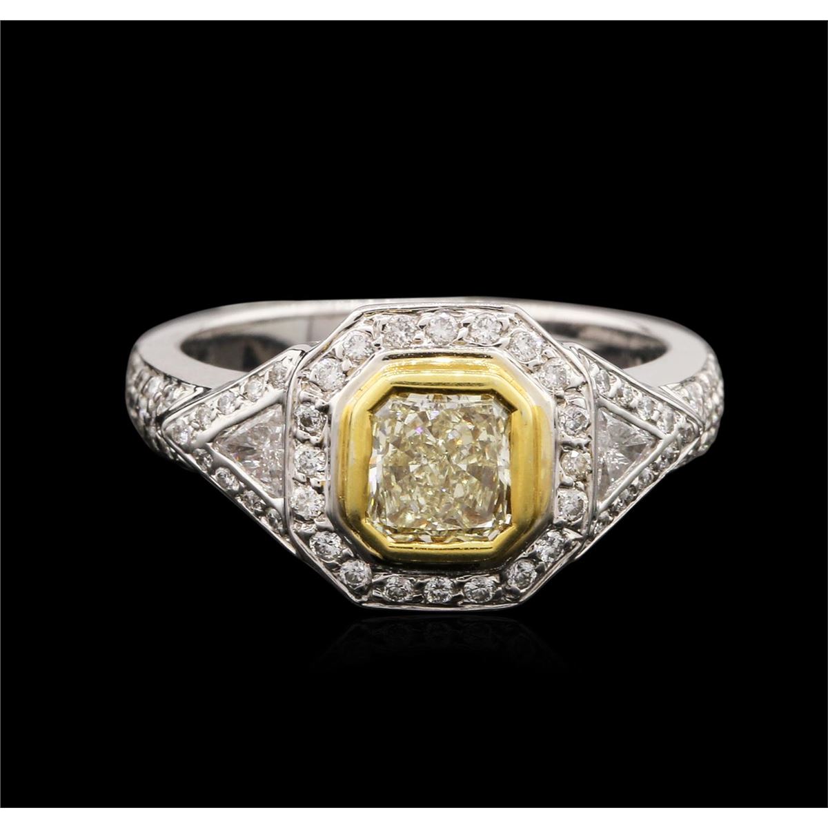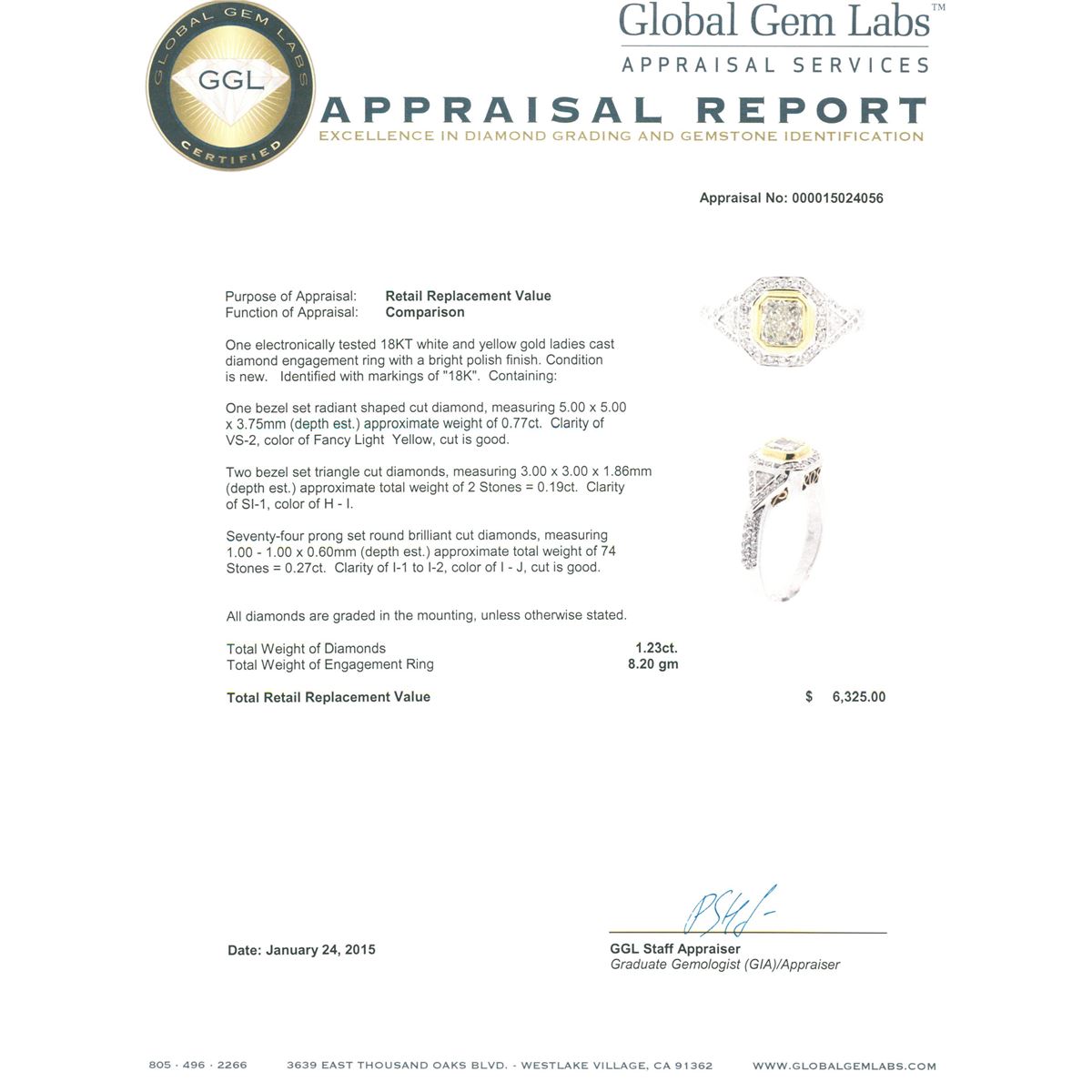 One electronically tested 18KT white and yellow gold ladies cast diamond engagement ring with a bright polish finish. Identified with markings of "18K". Condition is new. Containing: One bezel set radiant shaped cut diamond, measuring 5.00. x 5.00. x 3.75mm (depth est.) approximate weight of 0.77ct. Clarity: VS-2, Cut is Good. Two bezel set triangle cut diamonds, measuring 3.00. x 3.00. x 1.86mm (depth est.) approximate total weight of 2 Stones = 0.19ct. Clarity: SI-1. Color: H - I. Seventy-Four prong set round brilliant cut diamonds, measuring 1.00. - 1.00. x 0.60mm (depth est.) approximate total weight of 74 Stones = 0.27ct. Clarity: I-1 to I-2. Color: I - J, Cut is Good. All diamonds are graded in the mounting, unless otherwise stated. Total Weight of Diamonds 1.23ct. Total Weight of Engagement Ring 8.20 grams. GGL Appraised at $6,325.00.