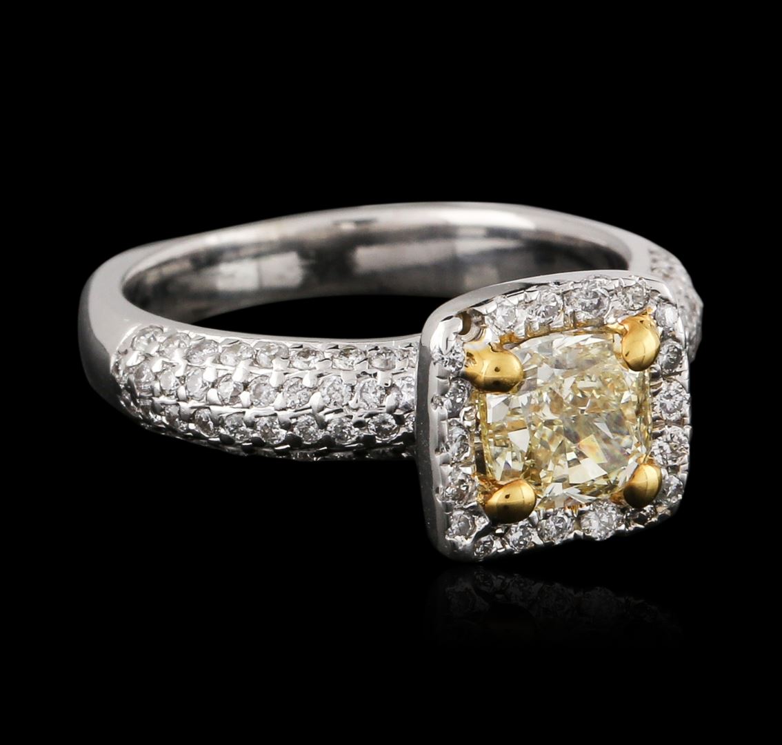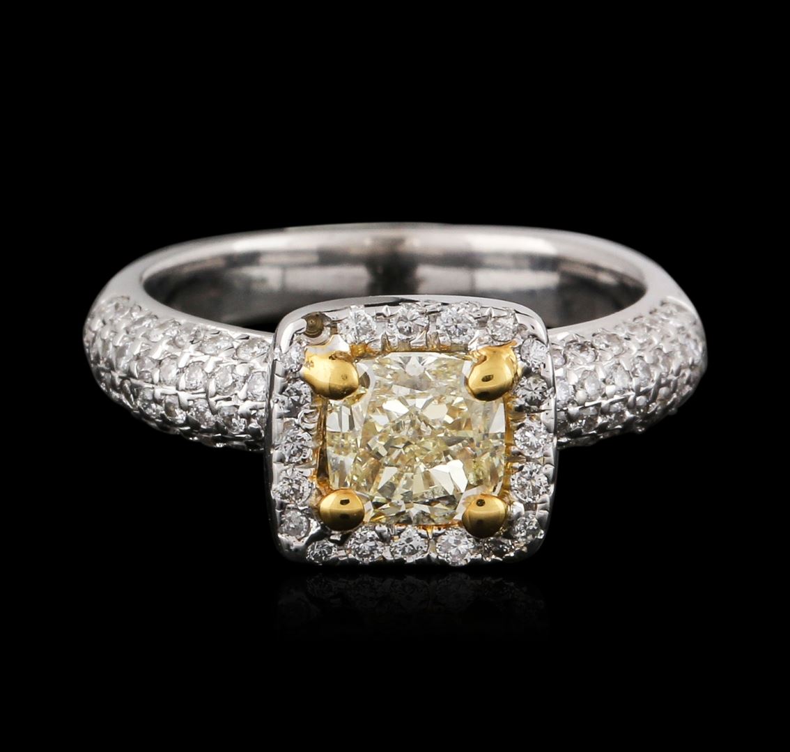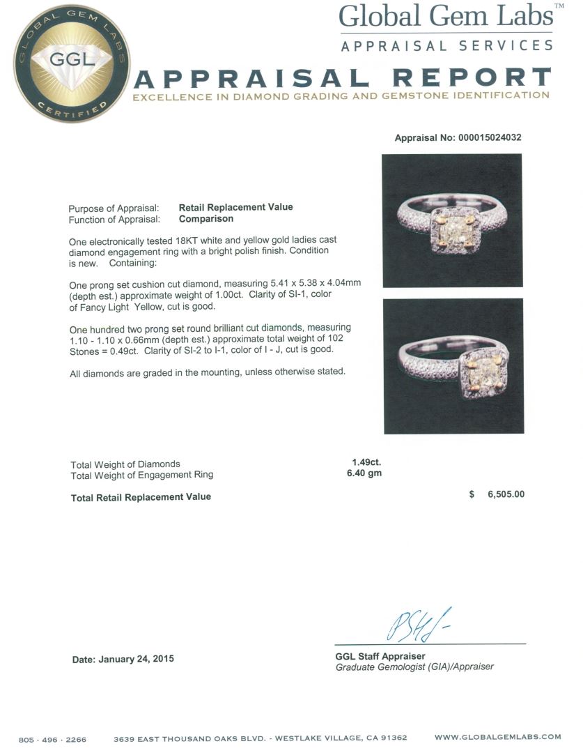One electronically tested 18KT white and yellow gold ladies cast diamond engagement ring with a bright polish finish. Condition is new. Containing: One prong set cushion cut diamond, measuring 5.41 x 5.38 x 4.04mm (depth est.) approximate weight of 1.00.ct. Clarity: SI-1, Cut is Good. One Hundred Two prong set round brilliant cut diamonds, measuring 1.10 - 1.10 x 0.66mm (depth est.) approximate total weight of 102 Stones = 0.49ct. Clarity: SI-2 to I-1. Color: I - J, Cut is Good. All diamonds are graded in the mounting, unless otherwise stated. Total Weight of Diamonds 1.49ct. Total Weight of Engagement Ring 6.40 grams. GGL Appraised at $6,505.00.