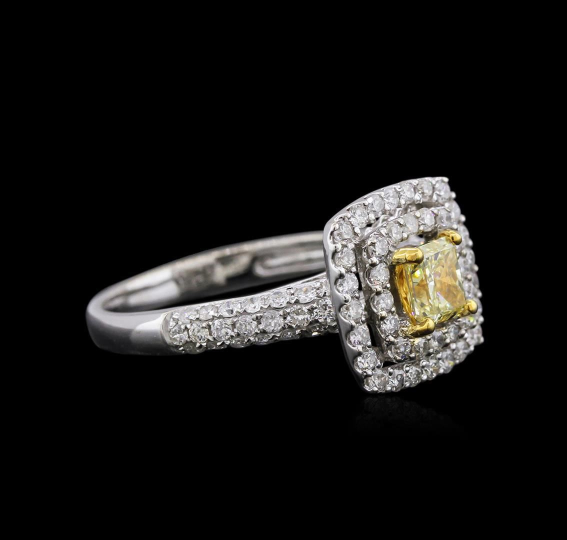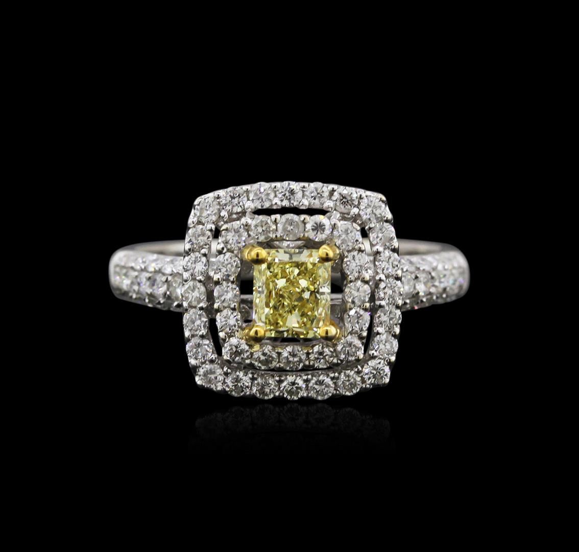 One polished, stamped, and tested 18K yellow & white gold ring mounted with: 1 genuine fancy color diamond center stone weighing 0.56 carat, and 100 genuine round diamonds weighing 1.12 carats. This item weighs 4.1 grams, condition is new, excellent workmanship. MAIN GEMSTONE: Identity: Natural Diamond. Shape: Rectangular Cut Cornered. Cutting Style: Modified Brilliant Cut. Measurements: 6.1 x 5.8 mm. Weight: 0.56 carat. Color Grade: Fancy Yellow. Polish: Very Good. Symmetry: Very Good. Refractive Index: 2.417. Hardness: 10. ADJACENT GEMSTONES ON RING: Identity: Natural Diamond. Shape: Round. Cutting Style: Round Brilliant. Quantity: 100 Diamonds. Measurements: 1.3 - 1.5 mm. Total Weight: 1.12 carats. Clarity Grade: SI1 - SI2. Color Grade: F - G. Refractive Index: 2.418. Hardness: 10. Center Diamond Weight: 0.56 ct. Total Diamond Weight: 1.68 cts. Weight of Item: 4.1 grams. Gold Content: 18K Yellow & White Gold. AIGL Appraised at $12,860.00.