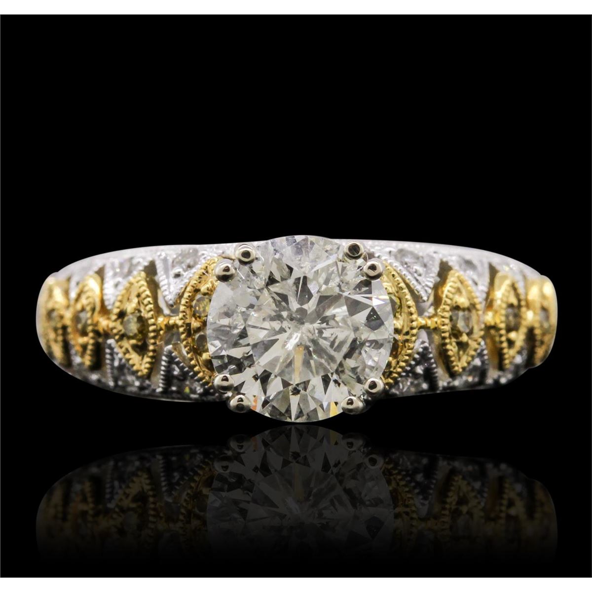 One electronically tested 18KT white and yellow gold ladies cast & assembled diamond ring. Condition is new, good workmanship. The featured diamond is supported by elaborate white and yellow diamond shoulders, completed by a three and one-half millimeter wide band. Bright polish finish with milgrain detailing throughout. Identified with markings of "18K". Containing: One prong set round brilliant cut diamond, measuring 7.20 - 7.20 x 4.85mm (depth est.) approximate weight of 1.63ct. Graded in the setting. Clarity: I-1 . Color: L Depth 67.4%. Table 59.7%. Twenty-Two bead set round brilliant cut diamonds, measuring 1.30 - 1.00 x 0.69mm (depth est.) approximate. Total Weight of 22 Stones = 0.22ct. Graded in the setting. Clarity: VS-2 to SI-1 . Color: G - I Twelve bead set round brilliant cut diamonds, measuring 1.40 - 1.30 x 0.81mm (depth est.) approximate. Total Weight of 12 Stones = 0.20ct. Indications of laboratory enhanced color. Graded in the setting. Clarity: VS-2 to SI-2 .. Total Weight of Diamonds 2.05ct.. Total Weight of Ring 5.76 grams. AIG Appraised at $22,775.00.
