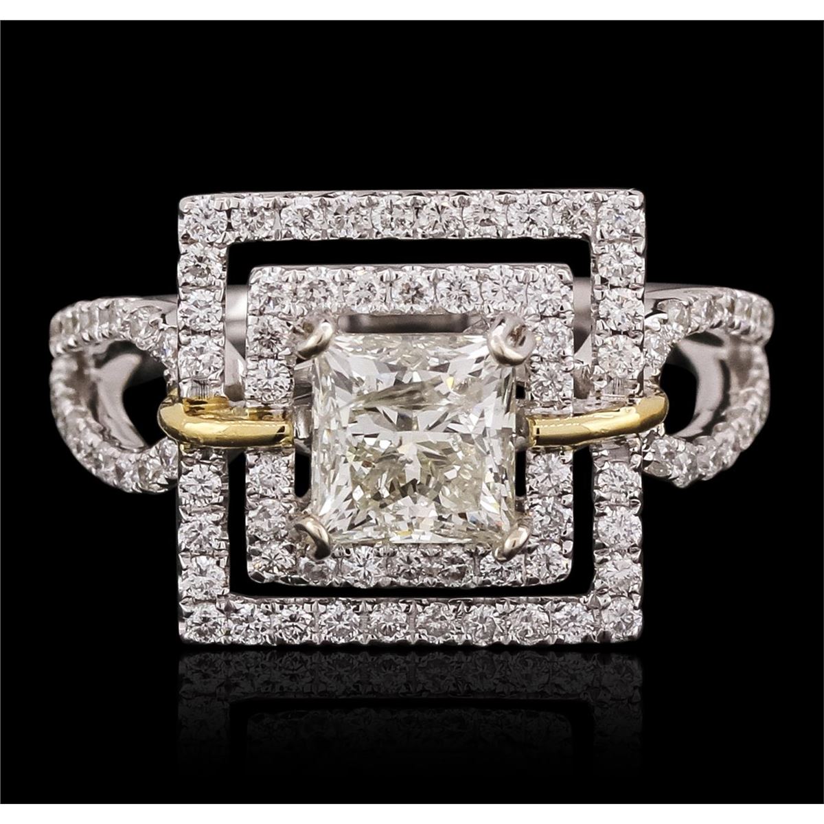 One electronically tested 18KT white and yellow gold ladies combination cast & assembled engagement ring with a bright polish finish. Identified with markings of "18K". Condition is new. Containing: One prong set princess cut diamond, measuring 6.10 x 5.95 x 4.46mm (depth est.) approximate weight of 1.33ct. Clarity: I-1. Color: K, Cut is Good. Ninety prong set round brilliant cut diamonds, measuring 1.20 - 1.20 x 0.72mm (depth est.) approximate total weight of 90 Stones = 0.76ct. Clarity: SI-1 to I-1. Color: H - I, Cut is Good. All diamonds are graded in the mounting, unless otherwise stated. Total Weight of Diamonds 2.09ct. Total Weight of Ring 6.10 grams. GGL Appraised at $19,925.00.