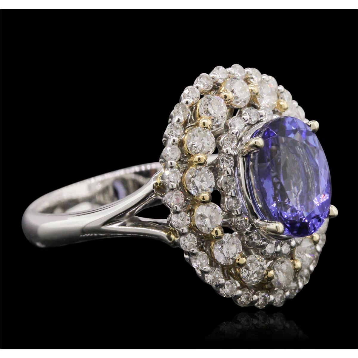 One electronically tested 18KT white and yellow gold Ladies combination cast & assembled fancy ring with a bright polish finish. Identified with markings of "18K". Condition is new. Containing: Eighteen prong set round brilliant cut diamonds, measuring 1.20 - 1.20 x 0.72mm (depth est.) approximate. Total Weight of 18 Stones = 0.15ct. Clarity: I-1. Color: G - H, Cut is Good. Thirty prong set round brilliant cut diamonds, measuring 1.30 - 1.30 x 0.78mm (depth est.) approximate. Total Weight of 30 Stones = 0.30ct. Clarity: I-1. Color: G - H, Cut is Good. Fourteen prong set round brilliant cut diamonds, measuring 2.20 - 2.20 x 1.32mm (depth est.) approximate. Total Weight of 14 Stones = 0.65ct. Clarity: I-1. Color: G - H, Cut is Good. One prong set oval modified mixed cut natural tanzanite, measuring 9.00 x 7.00 x 4.55mm, approximate weight of 2.28ct., clarity is eye clean, type I, medium light, very slightly grayish, violet color, (GIA V 4/3), cut is very good. Colored gemstones are presumed to have been subjected to commonly used color/clarity enhancement processes. Total Weight of Colored Stones 2.28ct. Total Weight of Diamonds 1.10ct. Total Weight of Ring 8.00 grams. GGL Appraised at $7,550.00.